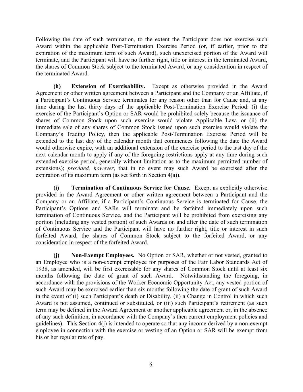 6. Following the date of such termination, to the extent the Participant does not exercise such Award within the applicable Post-Termination Exercise Period (or, if earlier, prior to the expiration of the maximum term of such Award), such unexercised portion of the Award will terminate, and the Participant will have no further right, title or interest in the terminated Award, the shares of Common Stock subject to the terminated Award, or any consideration in respect of the terminated Award. (h) Extension of Exercisability. Except as otherwise provided in the Award Agreement or other written agreement between a Participant and the Company or an Affiliate, if a Participant’s Continuous Service terminates for any reason other than for Cause and, at any time during the last thirty days of the applicable Post-Termination Exercise Period: (i) the exercise of the Participant’s Option or SAR would be prohibited solely because the issuance of shares of Common Stock upon such exercise would violate Applicable Law, or (ii) the immediate sale of any shares of Common Stock issued upon such exercise would violate the Company’s Trading Policy, then the applicable Post-Termination Exercise Period will be extended to the last day of the calendar month that commences following the date the Award would otherwise expire, with an additional extension of the exercise period to the last day of the next calendar month to apply if any of the foregoing restrictions apply at any time during such extended exercise period, generally without limitation as to the maximum permitted number of extensions); provided, however, that in no event may such Award be exercised after the expiration of its maximum term (as set forth in Section 4(a)). (i) Termination of Continuous Service for Cause. Except as explicitly otherwise provided in the Award Agreement or other written agreement between a Participant and the Company or an Affiliate, if a Participant’s Continuous Service is terminated for Cause, the Participant’s Options and SARs will terminate and be forfeited immediately upon such termination of Continuous Service, and the Participant will be prohibited from exercising any portion (including any vested portion) of such Awards on and after the date of such termination of Continuous Service and the Participant will have no further right, title or interest in such forfeited Award, the shares of Common Stock subject to the forfeited Award, or any consideration in respect of the forfeited Award. (j) Non-Exempt Employees. No Option or SAR, whether or not vested, granted to an Employee who is a non-exempt employee for purposes of the Fair Labor Standards Act of 1938, as amended, will be first exercisable for any shares of Common Stock until at least six months following the date of grant of such Award. Notwithstanding the foregoing, in accordance with the provisions of the Worker Economic Opportunity Act, any vested portion of such Award may be exercised earlier than six months following the date of grant of such Award in the event of (i) such Participant’s death or Disability, (ii) a Change in Control in which such Award is not assumed, continued or substituted, or (iii) such Participant’s retirement (as such term may be defined in the Award Agreement or another applicable agreement or, in the absence of any such definition, in accordance with the Company’s then current employment policies and guidelines). This Section 4(j) is intended to operate so that any income derived by a non-exempt employee in connection with the exercise or vesting of an Option or SAR will be exempt from his or her regular rate of pay.