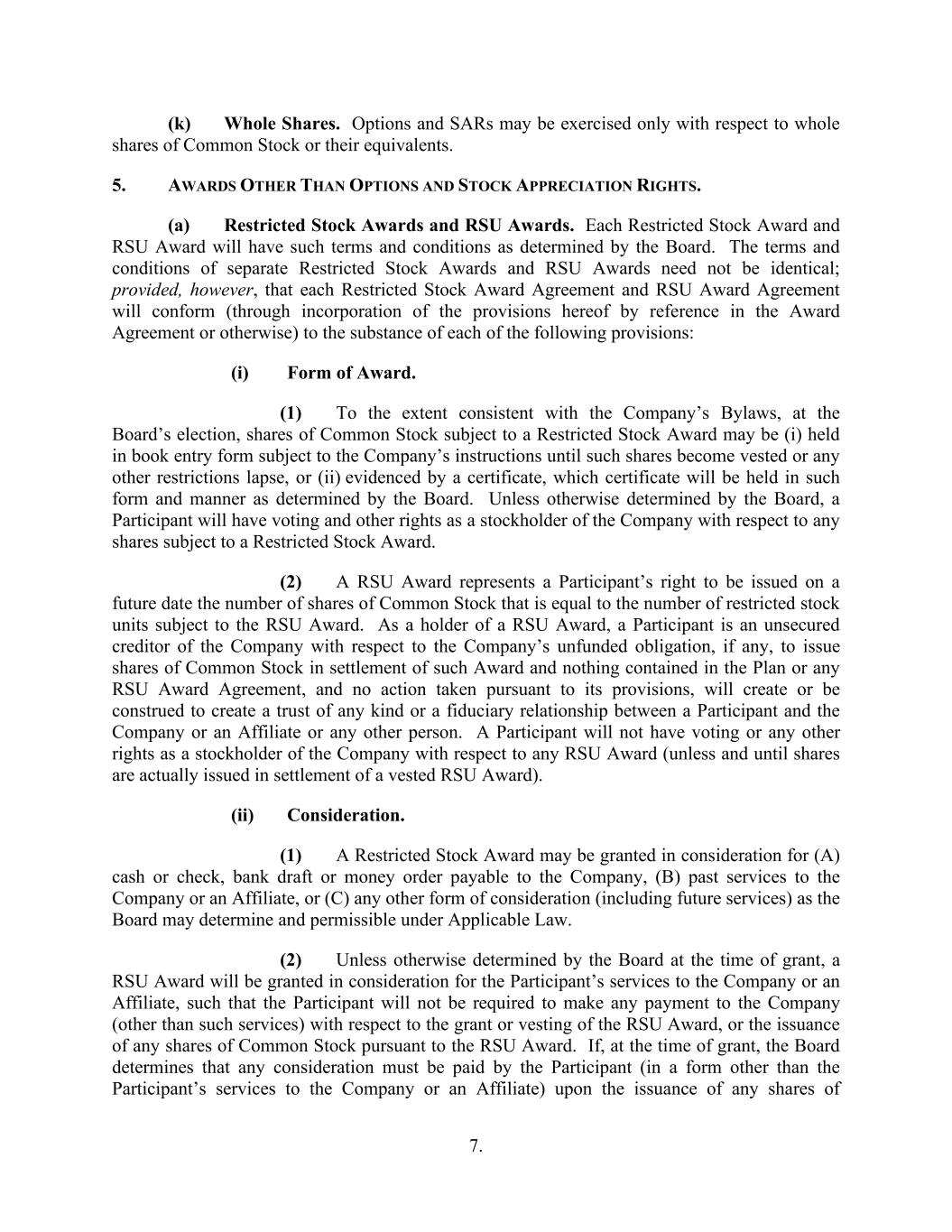 7. (k) Whole Shares. Options and SARs may be exercised only with respect to whole shares of Common Stock or their equivalents. 5. AWARDS OTHER THAN OPTIONS AND STOCK APPRECIATION RIGHTS. (a) Restricted Stock Awards and RSU Awards. Each Restricted Stock Award and RSU Award will have such terms and conditions as determined by the Board. The terms and conditions of separate Restricted Stock Awards and RSU Awards need not be identical; provided, however, that each Restricted Stock Award Agreement and RSU Award Agreement will conform (through incorporation of the provisions hereof by reference in the Award Agreement or otherwise) to the substance of each of the following provisions: (i) Form of Award. (1) To the extent consistent with the Company’s Bylaws, at the Board’s election, shares of Common Stock subject to a Restricted Stock Award may be (i) held in book entry form subject to the Company’s instructions until such shares become vested or any other restrictions lapse, or (ii) evidenced by a certificate, which certificate will be held in such form and manner as determined by the Board. Unless otherwise determined by the Board, a Participant will have voting and other rights as a stockholder of the Company with respect to any shares subject to a Restricted Stock Award. (2) A RSU Award represents a Participant’s right to be issued on a future date the number of shares of Common Stock that is equal to the number of restricted stock units subject to the RSU Award. As a holder of a RSU Award, a Participant is an unsecured creditor of the Company with respect to the Company’s unfunded obligation, if any, to issue shares of Common Stock in settlement of such Award and nothing contained in the Plan or any RSU Award Agreement, and no action taken pursuant to its provisions, will create or be construed to create a trust of any kind or a fiduciary relationship between a Participant and the Company or an Affiliate or any other person. A Participant will not have voting or any other rights as a stockholder of the Company with respect to any RSU Award (unless and until shares are actually issued in settlement of a vested RSU Award). (ii) Consideration. (1) A Restricted Stock Award may be granted in consideration for (A) cash or check, bank draft or money order payable to the Company, (B) past services to the Company or an Affiliate, or (C) any other form of consideration (including future services) as the Board may determine and permissible under Applicable Law. (2) Unless otherwise determined by the Board at the time of grant, a RSU Award will be granted in consideration for the Participant’s services to the Company or an Affiliate, such that the Participant will not be required to make any payment to the Company (other than such services) with respect to the grant or vesting of the RSU Award, or the issuance of any shares of Common Stock pursuant to the RSU Award. If, at the time of grant, the Board determines that any consideration must be paid by the Participant (in a form other than the Participant’s services to the Company or an Affiliate) upon the issuance of any shares of