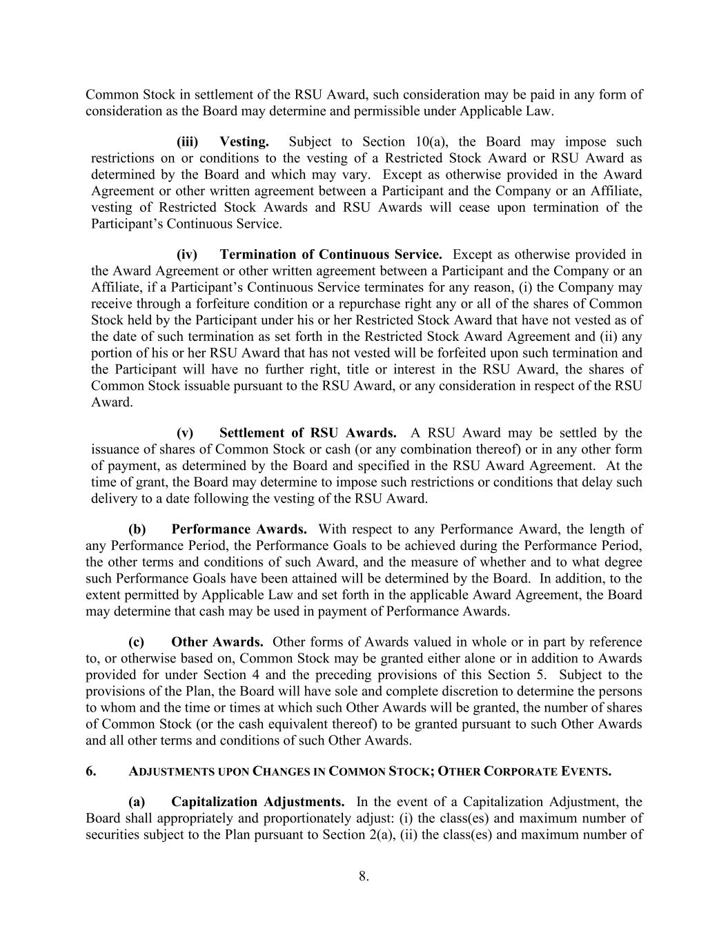 8. Common Stock in settlement of the RSU Award, such consideration may be paid in any form of consideration as the Board may determine and permissible under Applicable Law. (iii) Vesting. Subject to Section 10(a), the Board may impose such restrictions on or conditions to the vesting of a Restricted Stock Award or RSU Award as determined by the Board and which may vary. Except as otherwise provided in the Award Agreement or other written agreement between a Participant and the Company or an Affiliate, vesting of Restricted Stock Awards and RSU Awards will cease upon termination of the Participant’s Continuous Service. (iv) Termination of Continuous Service. Except as otherwise provided in the Award Agreement or other written agreement between a Participant and the Company or an Affiliate, if a Participant’s Continuous Service terminates for any reason, (i) the Company may receive through a forfeiture condition or a repurchase right any or all of the shares of Common Stock held by the Participant under his or her Restricted Stock Award that have not vested as of the date of such termination as set forth in the Restricted Stock Award Agreement and (ii) any portion of his or her RSU Award that has not vested will be forfeited upon such termination and the Participant will have no further right, title or interest in the RSU Award, the shares of Common Stock issuable pursuant to the RSU Award, or any consideration in respect of the RSU Award. (v) Settlement of RSU Awards. A RSU Award may be settled by the issuance of shares of Common Stock or cash (or any combination thereof) or in any other form of payment, as determined by the Board and specified in the RSU Award Agreement. At the time of grant, the Board may determine to impose such restrictions or conditions that delay such delivery to a date following the vesting of the RSU Award. (b) Performance Awards. With respect to any Performance Award, the length of any Performance Period, the Performance Goals to be achieved during the Performance Period, the other terms and conditions of such Award, and the measure of whether and to what degree such Performance Goals have been attained will be determined by the Board. In addition, to the extent permitted by Applicable Law and set forth in the applicable Award Agreement, the Board may determine that cash may be used in payment of Performance Awards. (c) Other Awards. Other forms of Awards valued in whole or in part by reference to, or otherwise based on, Common Stock may be granted either alone or in addition to Awards provided for under Section 4 and the preceding provisions of this Section 5. Subject to the provisions of the Plan, the Board will have sole and complete discretion to determine the persons to whom and the time or times at which such Other Awards will be granted, the number of shares of Common Stock (or the cash equivalent thereof) to be granted pursuant to such Other Awards and all other terms and conditions of such Other Awards. 6. ADJUSTMENTS UPON CHANGES IN COMMON STOCK; OTHER CORPORATE EVENTS. (a) Capitalization Adjustments. In the event of a Capitalization Adjustment, the Board shall appropriately and proportionately adjust: (i) the class(es) and maximum number of securities subject to the Plan pursuant to Section 2(a), (ii) the class(es) and maximum number of