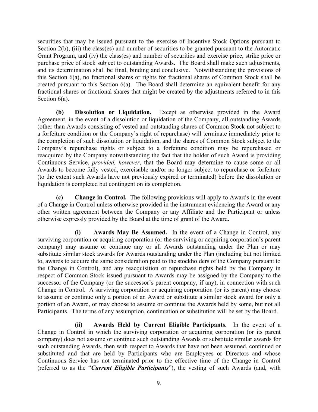9. securities that may be issued pursuant to the exercise of Incentive Stock Options pursuant to Section 2(b), (iii) the class(es) and number of securities to be granted pursuant to the Automatic Grant Program, and (iv) the class(es) and number of securities and exercise price, strike price or purchase price of stock subject to outstanding Awards. The Board shall make such adjustments, and its determination shall be final, binding and conclusive. Notwithstanding the provisions of this Section 6(a), no fractional shares or rights for fractional shares of Common Stock shall be created pursuant to this Section 6(a). The Board shall determine an equivalent benefit for any fractional shares or fractional shares that might be created by the adjustments referred to in this Section 6(a). (b) Dissolution or Liquidation. Except as otherwise provided in the Award Agreement, in the event of a dissolution or liquidation of the Company, all outstanding Awards (other than Awards consisting of vested and outstanding shares of Common Stock not subject to a forfeiture condition or the Company’s right of repurchase) will terminate immediately prior to the completion of such dissolution or liquidation, and the shares of Common Stock subject to the Company’s repurchase rights or subject to a forfeiture condition may be repurchased or reacquired by the Company notwithstanding the fact that the holder of such Award is providing Continuous Service, provided, however, that the Board may determine to cause some or all Awards to become fully vested, exercisable and/or no longer subject to repurchase or forfeiture (to the extent such Awards have not previously expired or terminated) before the dissolution or liquidation is completed but contingent on its completion. (c) Change in Control. The following provisions will apply to Awards in the event of a Change in Control unless otherwise provided in the instrument evidencing the Award or any other written agreement between the Company or any Affiliate and the Participant or unless otherwise expressly provided by the Board at the time of grant of the Award. (i) Awards May Be Assumed. In the event of a Change in Control, any surviving corporation or acquiring corporation (or the surviving or acquiring corporation’s parent company) may assume or continue any or all Awards outstanding under the Plan or may substitute similar stock awards for Awards outstanding under the Plan (including but not limited to, awards to acquire the same consideration paid to the stockholders of the Company pursuant to the Change in Control), and any reacquisition or repurchase rights held by the Company in respect of Common Stock issued pursuant to Awards may be assigned by the Company to the successor of the Company (or the successor’s parent company, if any), in connection with such Change in Control. A surviving corporation or acquiring corporation (or its parent) may choose to assume or continue only a portion of an Award or substitute a similar stock award for only a portion of an Award, or may choose to assume or continue the Awards held by some, but not all Participants. The terms of any assumption, continuation or substitution will be set by the Board. (ii) Awards Held by Current Eligible Participants. In the event of a Change in Control in which the surviving corporation or acquiring corporation (or its parent company) does not assume or continue such outstanding Awards or substitute similar awards for such outstanding Awards, then with respect to Awards that have not been assumed, continued or substituted and that are held by Participants who are Employees or Directors and whose Continuous Service has not terminated prior to the effective time of the Change in Control (referred to as the “Current Eligible Participants”), the vesting of such Awards (and, with