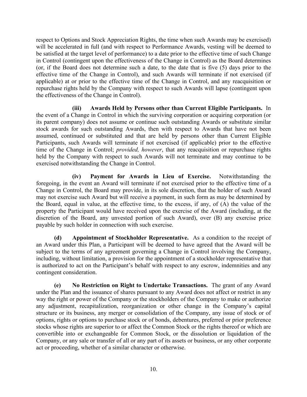 10. respect to Options and Stock Appreciation Rights, the time when such Awards may be exercised) will be accelerated in full (and with respect to Performance Awards, vesting will be deemed to be satisfied at the target level of performance) to a date prior to the effective time of such Change in Control (contingent upon the effectiveness of the Change in Control) as the Board determines (or, if the Board does not determine such a date, to the date that is five (5) days prior to the effective time of the Change in Control), and such Awards will terminate if not exercised (if applicable) at or prior to the effective time of the Change in Control, and any reacquisition or repurchase rights held by the Company with respect to such Awards will lapse (contingent upon the effectiveness of the Change in Control). (iii) Awards Held by Persons other than Current Eligible Participants. In the event of a Change in Control in which the surviving corporation or acquiring corporation (or its parent company) does not assume or continue such outstanding Awards or substitute similar stock awards for such outstanding Awards, then with respect to Awards that have not been assumed, continued or substituted and that are held by persons other than Current Eligible Participants, such Awards will terminate if not exercised (if applicable) prior to the effective time of the Change in Control; provided, however, that any reacquisition or repurchase rights held by the Company with respect to such Awards will not terminate and may continue to be exercised notwithstanding the Change in Control. (iv) Payment for Awards in Lieu of Exercise. Notwithstanding the foregoing, in the event an Award will terminate if not exercised prior to the effective time of a Change in Control, the Board may provide, in its sole discretion, that the holder of such Award may not exercise such Award but will receive a payment, in such form as may be determined by the Board, equal in value, at the effective time, to the excess, if any, of (A) the value of the property the Participant would have received upon the exercise of the Award (including, at the discretion of the Board, any unvested portion of such Award), over (B) any exercise price payable by such holder in connection with such exercise. (d) Appointment of Stockholder Representative. As a condition to the receipt of an Award under this Plan, a Participant will be deemed to have agreed that the Award will be subject to the terms of any agreement governing a Change in Control involving the Company, including, without limitation, a provision for the appointment of a stockholder representative that is authorized to act on the Participant’s behalf with respect to any escrow, indemnities and any contingent consideration. (e) No Restriction on Right to Undertake Transactions. The grant of any Award under the Plan and the issuance of shares pursuant to any Award does not affect or restrict in any way the right or power of the Company or the stockholders of the Company to make or authorize any adjustment, recapitalization, reorganization or other change in the Company’s capital structure or its business, any merger or consolidation of the Company, any issue of stock or of options, rights or options to purchase stock or of bonds, debentures, preferred or prior preference stocks whose rights are superior to or affect the Common Stock or the rights thereof or which are convertible into or exchangeable for Common Stock, or the dissolution or liquidation of the Company, or any sale or transfer of all or any part of its assets or business, or any other corporate act or proceeding, whether of a similar character or otherwise.