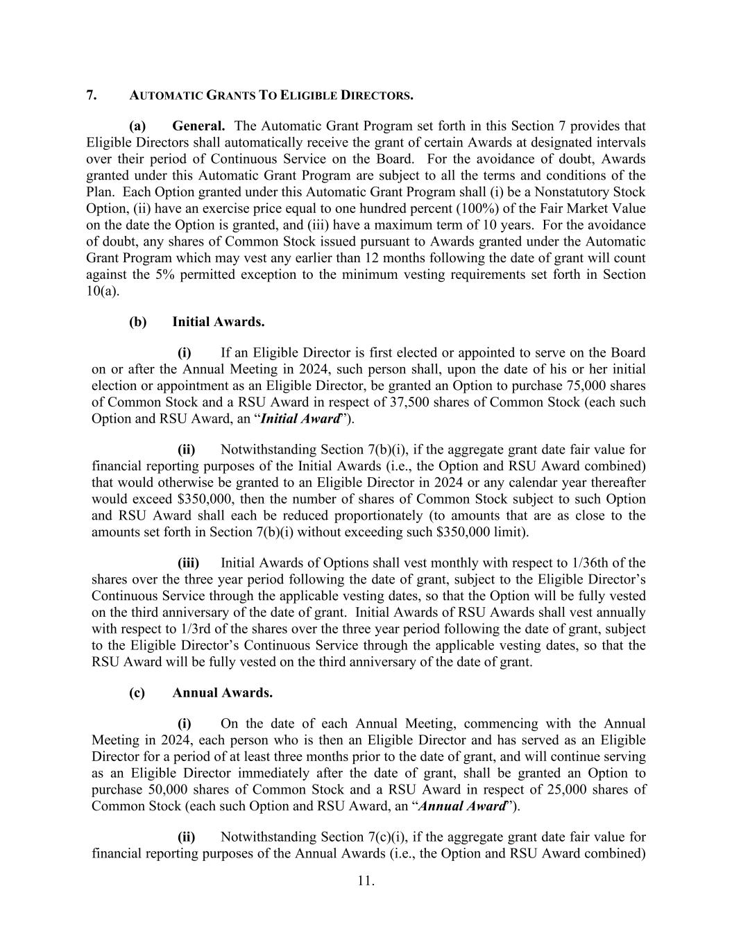 11. 7. AUTOMATIC GRANTS TO ELIGIBLE DIRECTORS. (a) General. The Automatic Grant Program set forth in this Section 7 provides that Eligible Directors shall automatically receive the grant of certain Awards at designated intervals over their period of Continuous Service on the Board. For the avoidance of doubt, Awards granted under this Automatic Grant Program are subject to all the terms and conditions of the Plan. Each Option granted under this Automatic Grant Program shall (i) be a Nonstatutory Stock Option, (ii) have an exercise price equal to one hundred percent (100%) of the Fair Market Value on the date the Option is granted, and (iii) have a maximum term of 10 years. For the avoidance of doubt, any shares of Common Stock issued pursuant to Awards granted under the Automatic Grant Program which may vest any earlier than 12 months following the date of grant will count against the 5% permitted exception to the minimum vesting requirements set forth in Section 10(a). (b) Initial Awards. (i) If an Eligible Director is first elected or appointed to serve on the Board on or after the Annual Meeting in 2024, such person shall, upon the date of his or her initial election or appointment as an Eligible Director, be granted an Option to purchase 75,000 shares of Common Stock and a RSU Award in respect of 37,500 shares of Common Stock (each such Option and RSU Award, an “Initial Award”). (ii) Notwithstanding Section 7(b)(i), if the aggregate grant date fair value for financial reporting purposes of the Initial Awards (i.e., the Option and RSU Award combined) that would otherwise be granted to an Eligible Director in 2024 or any calendar year thereafter would exceed $350,000, then the number of shares of Common Stock subject to such Option and RSU Award shall each be reduced proportionately (to amounts that are as close to the amounts set forth in Section 7(b)(i) without exceeding such $350,000 limit). (iii) Initial Awards of Options shall vest monthly with respect to 1/36th of the shares over the three year period following the date of grant, subject to the Eligible Director’s Continuous Service through the applicable vesting dates, so that the Option will be fully vested on the third anniversary of the date of grant. Initial Awards of RSU Awards shall vest annually with respect to 1/3rd of the shares over the three year period following the date of grant, subject to the Eligible Director’s Continuous Service through the applicable vesting dates, so that the RSU Award will be fully vested on the third anniversary of the date of grant. (c) Annual Awards. (i) On the date of each Annual Meeting, commencing with the Annual Meeting in 2024, each person who is then an Eligible Director and has served as an Eligible Director for a period of at least three months prior to the date of grant, and will continue serving as an Eligible Director immediately after the date of grant, shall be granted an Option to purchase 50,000 shares of Common Stock and a RSU Award in respect of 25,000 shares of Common Stock (each such Option and RSU Award, an “Annual Award”). (ii) Notwithstanding Section 7(c)(i), if the aggregate grant date fair value for financial reporting purposes of the Annual Awards (i.e., the Option and RSU Award combined)