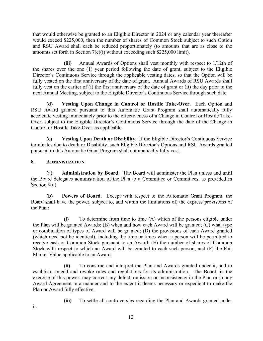 12. that would otherwise be granted to an Eligible Director in 2024 or any calendar year thereafter would exceed $225,000, then the number of shares of Common Stock subject to such Option and RSU Award shall each be reduced proportionately (to amounts that are as close to the amounts set forth in Section 7(c)(i) without exceeding such $225,000 limit). (iii) Annual Awards of Options shall vest monthly with respect to 1/12th of the shares over the one (1) year period following the date of grant, subject to the Eligible Director’s Continuous Service through the applicable vesting dates, so that the Option will be fully vested on the first anniversary of the date of grant. Annual Awards of RSU Awards shall fully vest on the earlier of (i) the first anniversary of the date of grant or (ii) the day prior to the next Annual Meeting, subject to the Eligible Director’s Continuous Service through such date. (d) Vesting Upon Change in Control or Hostile Take-Over. Each Option and RSU Award granted pursuant to this Automatic Grant Program shall automatically fully accelerate vesting immediately prior to the effectiveness of a Change in Control or Hostile Take- Over, subject to the Eligible Director’s Continuous Service through the date of the Change in Control or Hostile Take-Over, as applicable. (e) Vesting Upon Death or Disability. If the Eligible Director’s Continuous Service terminates due to death or Disability, such Eligible Director’s Options and RSU Awards granted pursuant to this Automatic Grant Program shall automatically fully vest. 8. ADMINISTRATION. (a) Administration by Board. The Board will administer the Plan unless and until the Board delegates administration of the Plan to a Committee or Committees, as provided in Section 8(d). (b) Powers of Board. Except with respect to the Automatic Grant Program, the Board shall have the power, subject to, and within the limitations of, the express provisions of the Plan: (i) To determine from time to time (A) which of the persons eligible under the Plan will be granted Awards; (B) when and how each Award will be granted; (C) what type or combination of types of Award will be granted; (D) the provisions of each Award granted (which need not be identical), including the time or times when a person will be permitted to receive cash or Common Stock pursuant to an Award; (E) the number of shares of Common Stock with respect to which an Award will be granted to each such person; and (F) the Fair Market Value applicable to an Award. (ii) To construe and interpret the Plan and Awards granted under it, and to establish, amend and revoke rules and regulations for its administration. The Board, in the exercise of this power, may correct any defect, omission or inconsistency in the Plan or in any Award Agreement in a manner and to the extent it deems necessary or expedient to make the Plan or Award fully effective. (iii) To settle all controversies regarding the Plan and Awards granted under it.