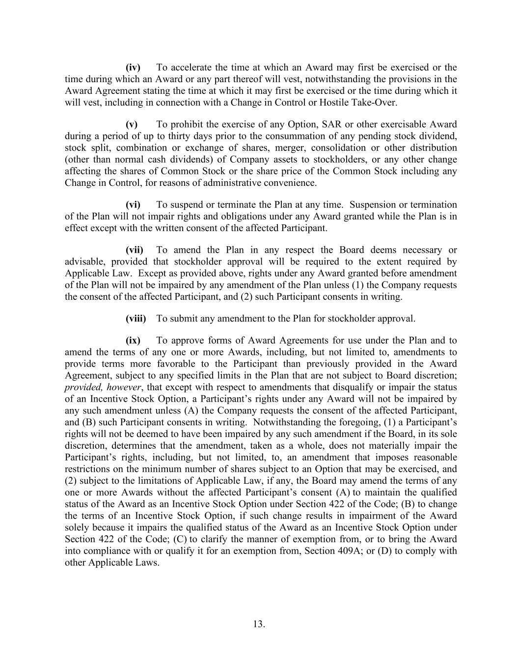 13. (iv) To accelerate the time at which an Award may first be exercised or the time during which an Award or any part thereof will vest, notwithstanding the provisions in the Award Agreement stating the time at which it may first be exercised or the time during which it will vest, including in connection with a Change in Control or Hostile Take-Over. (v) To prohibit the exercise of any Option, SAR or other exercisable Award during a period of up to thirty days prior to the consummation of any pending stock dividend, stock split, combination or exchange of shares, merger, consolidation or other distribution (other than normal cash dividends) of Company assets to stockholders, or any other change affecting the shares of Common Stock or the share price of the Common Stock including any Change in Control, for reasons of administrative convenience. (vi) To suspend or terminate the Plan at any time. Suspension or termination of the Plan will not impair rights and obligations under any Award granted while the Plan is in effect except with the written consent of the affected Participant. (vii) To amend the Plan in any respect the Board deems necessary or advisable, provided that stockholder approval will be required to the extent required by Applicable Law. Except as provided above, rights under any Award granted before amendment of the Plan will not be impaired by any amendment of the Plan unless (1) the Company requests the consent of the affected Participant, and (2) such Participant consents in writing. (viii) To submit any amendment to the Plan for stockholder approval. (ix) To approve forms of Award Agreements for use under the Plan and to amend the terms of any one or more Awards, including, but not limited to, amendments to provide terms more favorable to the Participant than previously provided in the Award Agreement, subject to any specified limits in the Plan that are not subject to Board discretion; provided, however, that except with respect to amendments that disqualify or impair the status of an Incentive Stock Option, a Participant’s rights under any Award will not be impaired by any such amendment unless (A) the Company requests the consent of the affected Participant, and (B) such Participant consents in writing. Notwithstanding the foregoing, (1) a Participant’s rights will not be deemed to have been impaired by any such amendment if the Board, in its sole discretion, determines that the amendment, taken as a whole, does not materially impair the Participant’s rights, including, but not limited, to, an amendment that imposes reasonable restrictions on the minimum number of shares subject to an Option that may be exercised, and (2) subject to the limitations of Applicable Law, if any, the Board may amend the terms of any one or more Awards without the affected Participant’s consent (A) to maintain the qualified status of the Award as an Incentive Stock Option under Section 422 of the Code; (B) to change the terms of an Incentive Stock Option, if such change results in impairment of the Award solely because it impairs the qualified status of the Award as an Incentive Stock Option under Section 422 of the Code; (C) to clarify the manner of exemption from, or to bring the Award into compliance with or qualify it for an exemption from, Section 409A; or (D) to comply with other Applicable Laws.