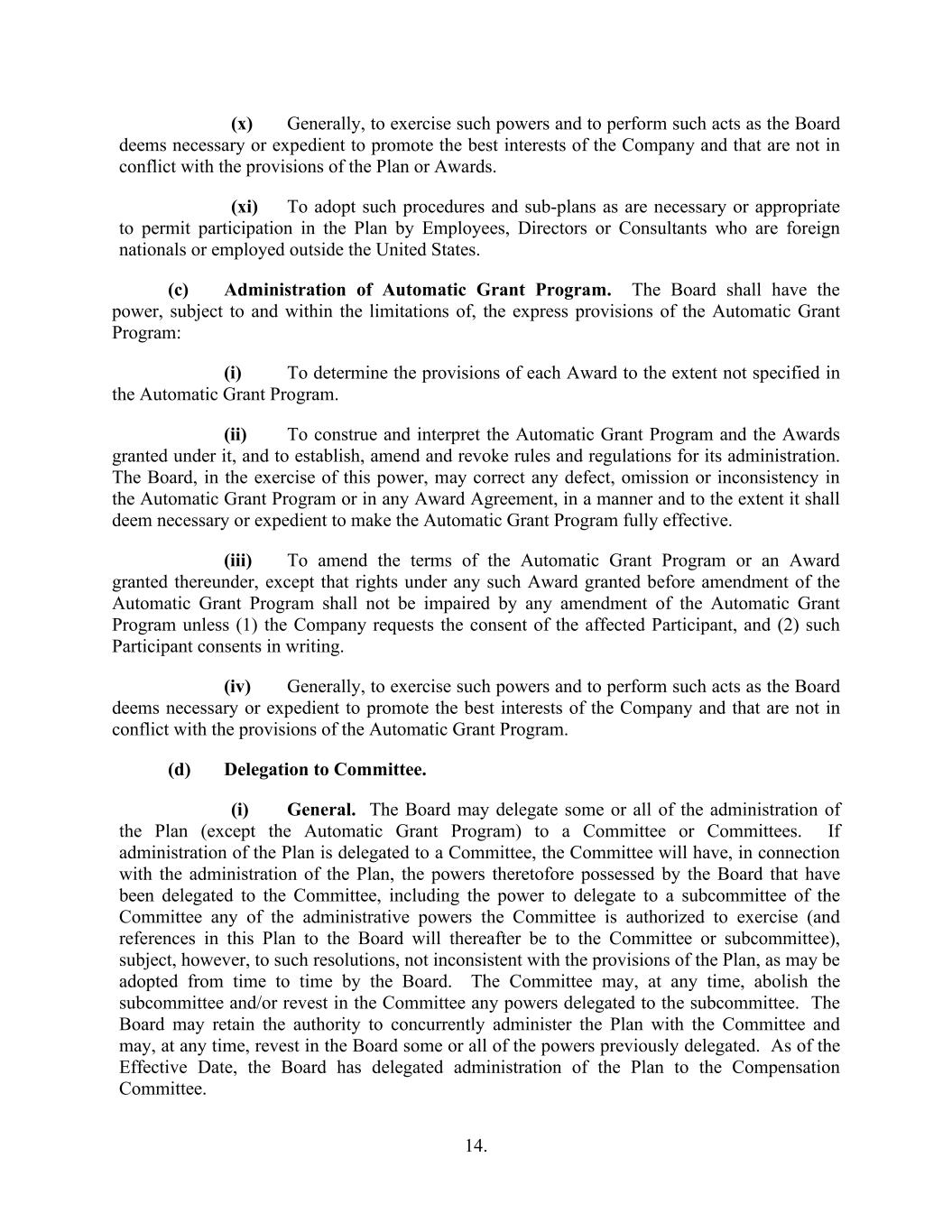 14. (x) Generally, to exercise such powers and to perform such acts as the Board deems necessary or expedient to promote the best interests of the Company and that are not in conflict with the provisions of the Plan or Awards. (xi) To adopt such procedures and sub-plans as are necessary or appropriate to permit participation in the Plan by Employees, Directors or Consultants who are foreign nationals or employed outside the United States. (c) Administration of Automatic Grant Program. The Board shall have the power, subject to and within the limitations of, the express provisions of the Automatic Grant Program: (i) To determine the provisions of each Award to the extent not specified in the Automatic Grant Program. (ii) To construe and interpret the Automatic Grant Program and the Awards granted under it, and to establish, amend and revoke rules and regulations for its administration. The Board, in the exercise of this power, may correct any defect, omission or inconsistency in the Automatic Grant Program or in any Award Agreement, in a manner and to the extent it shall deem necessary or expedient to make the Automatic Grant Program fully effective. (iii) To amend the terms of the Automatic Grant Program or an Award granted thereunder, except that rights under any such Award granted before amendment of the Automatic Grant Program shall not be impaired by any amendment of the Automatic Grant Program unless (1) the Company requests the consent of the affected Participant, and (2) such Participant consents in writing. (iv) Generally, to exercise such powers and to perform such acts as the Board deems necessary or expedient to promote the best interests of the Company and that are not in conflict with the provisions of the Automatic Grant Program. (d) Delegation to Committee. (i) General. The Board may delegate some or all of the administration of the Plan (except the Automatic Grant Program) to a Committee or Committees. If administration of the Plan is delegated to a Committee, the Committee will have, in connection with the administration of the Plan, the powers theretofore possessed by the Board that have been delegated to the Committee, including the power to delegate to a subcommittee of the Committee any of the administrative powers the Committee is authorized to exercise (and references in this Plan to the Board will thereafter be to the Committee or subcommittee), subject, however, to such resolutions, not inconsistent with the provisions of the Plan, as may be adopted from time to time by the Board. The Committee may, at any time, abolish the subcommittee and/or revest in the Committee any powers delegated to the subcommittee. The Board may retain the authority to concurrently administer the Plan with the Committee and may, at any time, revest in the Board some or all of the powers previously delegated. As of the Effective Date, the Board has delegated administration of the Plan to the Compensation Committee.
