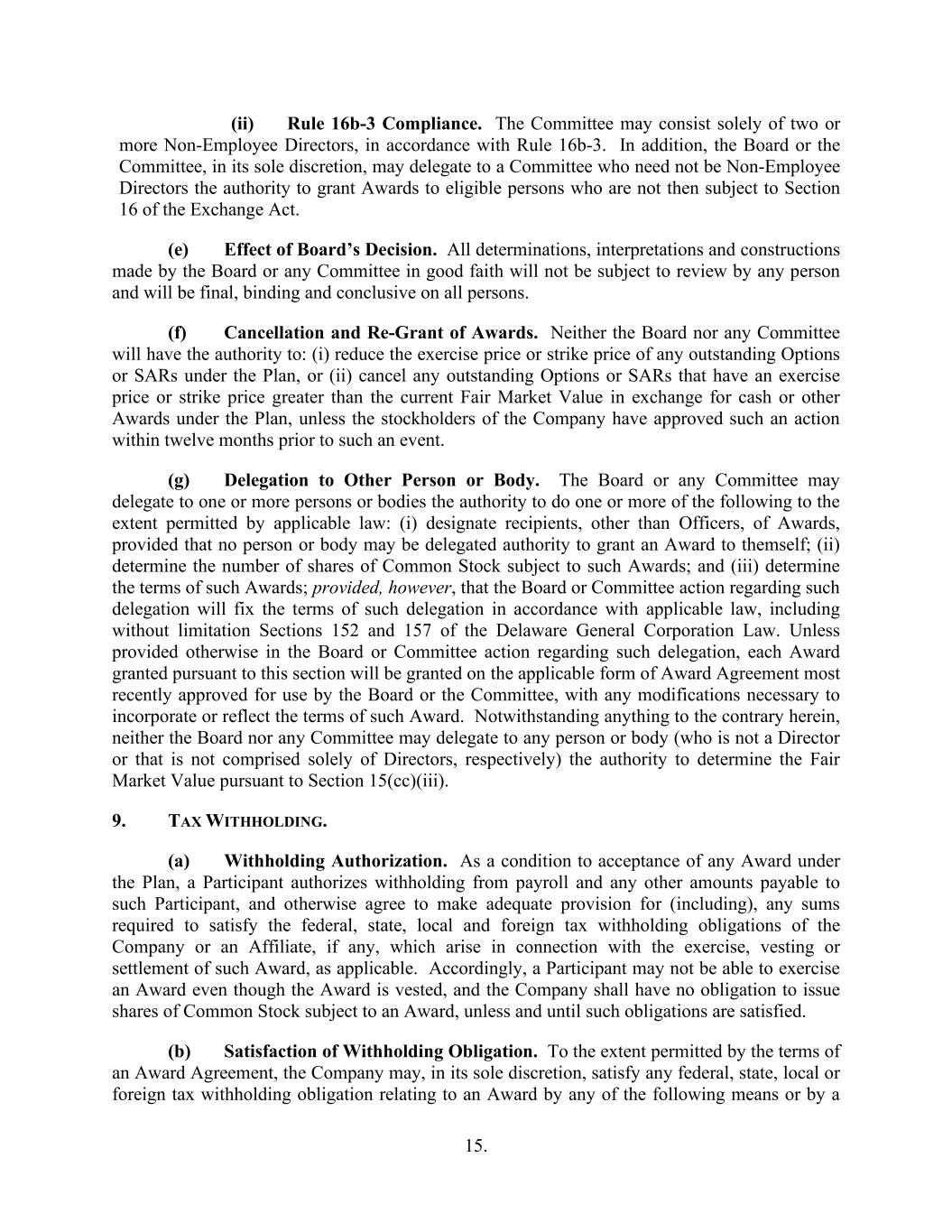 15. (ii) Rule 16b-3 Compliance. The Committee may consist solely of two or more Non-Employee Directors, in accordance with Rule 16b-3. In addition, the Board or the Committee, in its sole discretion, may delegate to a Committee who need not be Non-Employee Directors the authority to grant Awards to eligible persons who are not then subject to Section 16 of the Exchange Act. (e) Effect of Board’s Decision. All determinations, interpretations and constructions made by the Board or any Committee in good faith will not be subject to review by any person and will be final, binding and conclusive on all persons. (f) Cancellation and Re-Grant of Awards. Neither the Board nor any Committee will have the authority to: (i) reduce the exercise price or strike price of any outstanding Options or SARs under the Plan, or (ii) cancel any outstanding Options or SARs that have an exercise price or strike price greater than the current Fair Market Value in exchange for cash or other Awards under the Plan, unless the stockholders of the Company have approved such an action within twelve months prior to such an event. (g) Delegation to Other Person or Body. The Board or any Committee may delegate to one or more persons or bodies the authority to do one or more of the following to the extent permitted by applicable law: (i) designate recipients, other than Officers, of Awards, provided that no person or body may be delegated authority to grant an Award to themself; (ii) determine the number of shares of Common Stock subject to such Awards; and (iii) determine the terms of such Awards; provided, however, that the Board or Committee action regarding such delegation will fix the terms of such delegation in accordance with applicable law, including without limitation Sections 152 and 157 of the Delaware General Corporation Law. Unless provided otherwise in the Board or Committee action regarding such delegation, each Award granted pursuant to this section will be granted on the applicable form of Award Agreement most recently approved for use by the Board or the Committee, with any modifications necessary to incorporate or reflect the terms of such Award. Notwithstanding anything to the contrary herein, neither the Board nor any Committee may delegate to any person or body (who is not a Director or that is not comprised solely of Directors, respectively) the authority to determine the Fair Market Value pursuant to Section 15(cc)(iii). 9. TAX WITHHOLDING. (a) Withholding Authorization. As a condition to acceptance of any Award under the Plan, a Participant authorizes withholding from payroll and any other amounts payable to such Participant, and otherwise agree to make adequate provision for (including), any sums required to satisfy the federal, state, local and foreign tax withholding obligations of the Company or an Affiliate, if any, which arise in connection with the exercise, vesting or settlement of such Award, as applicable. Accordingly, a Participant may not be able to exercise an Award even though the Award is vested, and the Company shall have no obligation to issue shares of Common Stock subject to an Award, unless and until such obligations are satisfied. (b) Satisfaction of Withholding Obligation. To the extent permitted by the terms of an Award Agreement, the Company may, in its sole discretion, satisfy any federal, state, local or foreign tax withholding obligation relating to an Award by any of the following means or by a