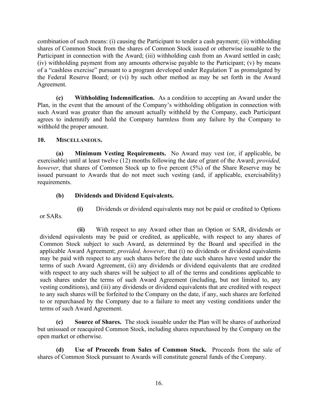 16. combination of such means: (i) causing the Participant to tender a cash payment; (ii) withholding shares of Common Stock from the shares of Common Stock issued or otherwise issuable to the Participant in connection with the Award; (iii) withholding cash from an Award settled in cash; (iv) withholding payment from any amounts otherwise payable to the Participant; (v) by means of a “cashless exercise” pursuant to a program developed under Regulation T as promulgated by the Federal Reserve Board; or (vi) by such other method as may be set forth in the Award Agreement. (c) Withholding Indemnification. As a condition to accepting an Award under the Plan, in the event that the amount of the Company’s withholding obligation in connection with such Award was greater than the amount actually withheld by the Company, each Participant agrees to indemnify and hold the Company harmless from any failure by the Company to withhold the proper amount. 10. MISCELLANEOUS. (a) Minimum Vesting Requirements. No Award may vest (or, if applicable, be exercisable) until at least twelve (12) months following the date of grant of the Award; provided, however, that shares of Common Stock up to five percent (5%) of the Share Reserve may be issued pursuant to Awards that do not meet such vesting (and, if applicable, exercisability) requirements. (b) Dividends and Dividend Equivalents. (i) Dividends or dividend equivalents may not be paid or credited to Options or SARs. (ii) With respect to any Award other than an Option or SAR, dividends or dividend equivalents may be paid or credited, as applicable, with respect to any shares of Common Stock subject to such Award, as determined by the Board and specified in the applicable Award Agreement; provided, however, that (i) no dividends or dividend equivalents may be paid with respect to any such shares before the date such shares have vested under the terms of such Award Agreement, (ii) any dividends or dividend equivalents that are credited with respect to any such shares will be subject to all of the terms and conditions applicable to such shares under the terms of such Award Agreement (including, but not limited to, any vesting conditions), and (iii) any dividends or dividend equivalents that are credited with respect to any such shares will be forfeited to the Company on the date, if any, such shares are forfeited to or repurchased by the Company due to a failure to meet any vesting conditions under the terms of such Award Agreement. (c) Source of Shares. The stock issuable under the Plan will be shares of authorized but unissued or reacquired Common Stock, including shares repurchased by the Company on the open market or otherwise. (d) Use of Proceeds from Sales of Common Stock. Proceeds from the sale of shares of Common Stock pursuant to Awards will constitute general funds of the Company.