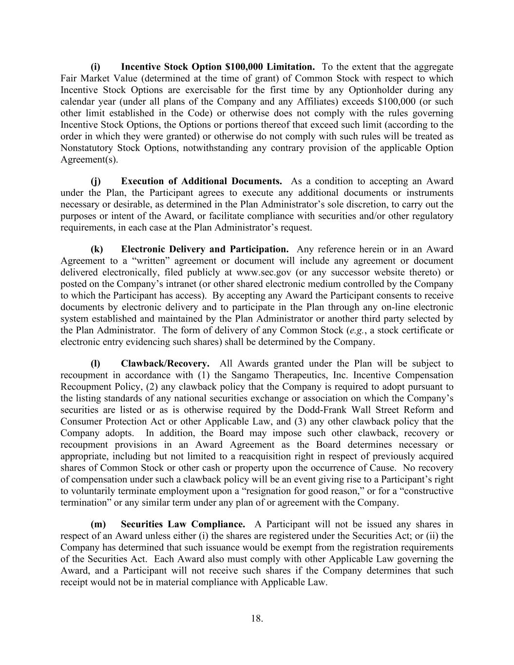 18. (i) Incentive Stock Option $100,000 Limitation. To the extent that the aggregate Fair Market Value (determined at the time of grant) of Common Stock with respect to which Incentive Stock Options are exercisable for the first time by any Optionholder during any calendar year (under all plans of the Company and any Affiliates) exceeds $100,000 (or such other limit established in the Code) or otherwise does not comply with the rules governing Incentive Stock Options, the Options or portions thereof that exceed such limit (according to the order in which they were granted) or otherwise do not comply with such rules will be treated as Nonstatutory Stock Options, notwithstanding any contrary provision of the applicable Option Agreement(s). (j) Execution of Additional Documents. As a condition to accepting an Award under the Plan, the Participant agrees to execute any additional documents or instruments necessary or desirable, as determined in the Plan Administrator’s sole discretion, to carry out the purposes or intent of the Award, or facilitate compliance with securities and/or other regulatory requirements, in each case at the Plan Administrator’s request. (k) Electronic Delivery and Participation. Any reference herein or in an Award Agreement to a “written” agreement or document will include any agreement or document delivered electronically, filed publicly at www.sec.gov (or any successor website thereto) or posted on the Company’s intranet (or other shared electronic medium controlled by the Company to which the Participant has access). By accepting any Award the Participant consents to receive documents by electronic delivery and to participate in the Plan through any on-line electronic system established and maintained by the Plan Administrator or another third party selected by the Plan Administrator. The form of delivery of any Common Stock (e.g., a stock certificate or electronic entry evidencing such shares) shall be determined by the Company. (l) Clawback/Recovery. All Awards granted under the Plan will be subject to recoupment in accordance with (1) the Sangamo Therapeutics, Inc. Incentive Compensation Recoupment Policy, (2) any clawback policy that the Company is required to adopt pursuant to the listing standards of any national securities exchange or association on which the Company’s securities are listed or as is otherwise required by the Dodd-Frank Wall Street Reform and Consumer Protection Act or other Applicable Law, and (3) any other clawback policy that the Company adopts. In addition, the Board may impose such other clawback, recovery or recoupment provisions in an Award Agreement as the Board determines necessary or appropriate, including but not limited to a reacquisition right in respect of previously acquired shares of Common Stock or other cash or property upon the occurrence of Cause. No recovery of compensation under such a clawback policy will be an event giving rise to a Participant’s right to voluntarily terminate employment upon a “resignation for good reason,” or for a “constructive termination” or any similar term under any plan of or agreement with the Company. (m) Securities Law Compliance. A Participant will not be issued any shares in respect of an Award unless either (i) the shares are registered under the Securities Act; or (ii) the Company has determined that such issuance would be exempt from the registration requirements of the Securities Act. Each Award also must comply with other Applicable Law governing the Award, and a Participant will not receive such shares if the Company determines that such receipt would not be in material compliance with Applicable Law.