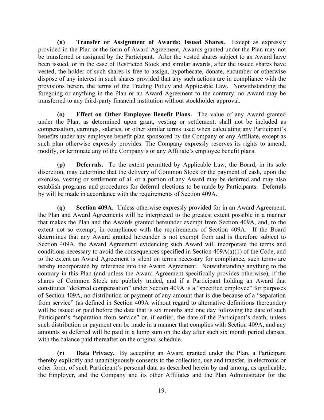 19. (n) Transfer or Assignment of Awards; Issued Shares. Except as expressly provided in the Plan or the form of Award Agreement, Awards granted under the Plan may not be transferred or assigned by the Participant. After the vested shares subject to an Award have been issued, or in the case of Restricted Stock and similar awards, after the issued shares have vested, the holder of such shares is free to assign, hypothecate, donate, encumber or otherwise dispose of any interest in such shares provided that any such actions are in compliance with the provisions herein, the terms of the Trading Policy and Applicable Law. Notwithstanding the foregoing or anything in the Plan or an Award Agreement to the contrary, no Award may be transferred to any third-party financial institution without stockholder approval. (o) Effect on Other Employee Benefit Plans. The value of any Award granted under the Plan, as determined upon grant, vesting or settlement, shall not be included as compensation, earnings, salaries, or other similar terms used when calculating any Participant’s benefits under any employee benefit plan sponsored by the Company or any Affiliate, except as such plan otherwise expressly provides. The Company expressly reserves its rights to amend, modify, or terminate any of the Company’s or any Affiliate’s employee benefit plans. (p) Deferrals. To the extent permitted by Applicable Law, the Board, in its sole discretion, may determine that the delivery of Common Stock or the payment of cash, upon the exercise, vesting or settlement of all or a portion of any Award may be deferred and may also establish programs and procedures for deferral elections to be made by Participants. Deferrals by will be made in accordance with the requirements of Section 409A. (q) Section 409A. Unless otherwise expressly provided for in an Award Agreement, the Plan and Award Agreements will be interpreted to the greatest extent possible in a manner that makes the Plan and the Awards granted hereunder exempt from Section 409A, and, to the extent not so exempt, in compliance with the requirements of Section 409A. If the Board determines that any Award granted hereunder is not exempt from and is therefore subject to Section 409A, the Award Agreement evidencing such Award will incorporate the terms and conditions necessary to avoid the consequences specified in Section 409A(a)(1) of the Code, and to the extent an Award Agreement is silent on terms necessary for compliance, such terms are hereby incorporated by reference into the Award Agreement. Notwithstanding anything to the contrary in this Plan (and unless the Award Agreement specifically provides otherwise), if the shares of Common Stock are publicly traded, and if a Participant holding an Award that constitutes “deferred compensation” under Section 409A is a “specified employee” for purposes of Section 409A, no distribution or payment of any amount that is due because of a “separation from service” (as defined in Section 409A without regard to alternative definitions thereunder) will be issued or paid before the date that is six months and one day following the date of such Participant’s “separation from service” or, if earlier, the date of the Participant’s death, unless such distribution or payment can be made in a manner that complies with Section 409A, and any amounts so deferred will be paid in a lump sum on the day after such six month period elapses, with the balance paid thereafter on the original schedule. (r) Data Privacy. By accepting an Award granted under the Plan, a Participant thereby explicitly and unambiguously consents to the collection, use and transfer, in electronic or other form, of such Participant’s personal data as described herein by and among, as applicable, the Employer, and the Company and its other Affiliates and the Plan Administrator for the