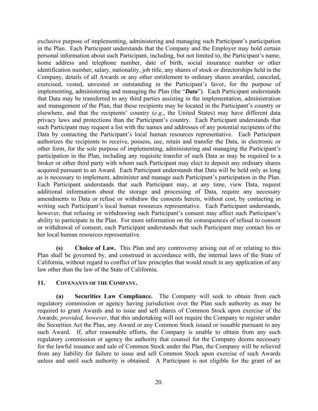 20. exclusive purpose of implementing, administering and managing such Participant’s participation in the Plan. Each Participant understands that the Company and the Employer may hold certain personal information about such Participant, including, but not limited to, the Participant’s name, home address and telephone number, date of birth, social insurance number or other identification number, salary, nationality, job title, any shares of stock or directorships held in the Company, details of all Awards or any other entitlement to ordinary shares awarded, canceled, exercised, vested, unvested or outstanding in the Participant’s favor, for the purpose of implementing, administering and managing the Plan (the “Data”). Each Participant understands that Data may be transferred to any third parties assisting in the implementation, administration and management of the Plan, that these recipients may be located in the Participant’s country or elsewhere, and that the recipients’ country (e.g., the United States) may have different data privacy laws and protections than the Participant’s country. Each Participant understands that such Participant may request a list with the names and addresses of any potential recipients of the Data by contacting the Participant’s local human resources representative. Each Participant authorizes the recipients to receive, possess, use, retain and transfer the Data, in electronic or other form, for the sole purpose of implementing, administering and managing the Participant’s participation in the Plan, including any requisite transfer of such Data as may be required to a broker or other third party with whom such Participant may elect to deposit any ordinary shares acquired pursuant to an Award. Each Participant understands that Data will be held only as long as is necessary to implement, administer and manage such Participant’s participation in the Plan. Each Participant understands that such Participant may, at any time, view Data, request additional information about the storage and processing of Data, require any necessary amendments to Data or refuse or withdraw the consents herein, without cost, by contacting in writing such Participant’s local human resources representative. Each Participant understands, however, that refusing or withdrawing such Participant’s consent may affect such Participant’s ability to participate in the Plan. For more information on the consequences of refusal to consent or withdrawal of consent, each Participant understands that such Participant may contact his or her local human resources representative. (s) Choice of Law. This Plan and any controversy arising out of or relating to this Plan shall be governed by, and construed in accordance with, the internal laws of the State of California, without regard to conflict of law principles that would result in any application of any law other than the law of the State of California. 11. COVENANTS OF THE COMPANY. (a) Securities Law Compliance. The Company will seek to obtain from each regulatory commission or agency having jurisdiction over the Plan such authority as may be required to grant Awards and to issue and sell shares of Common Stock upon exercise of the Awards; provided, however, that this undertaking will not require the Company to register under the Securities Act the Plan, any Award or any Common Stock issued or issuable pursuant to any such Award. If, after reasonable efforts, the Company is unable to obtain from any such regulatory commission or agency the authority that counsel for the Company deems necessary for the lawful issuance and sale of Common Stock under the Plan, the Company will be relieved from any liability for failure to issue and sell Common Stock upon exercise of such Awards unless and until such authority is obtained. A Participant is not eligible for the grant of an