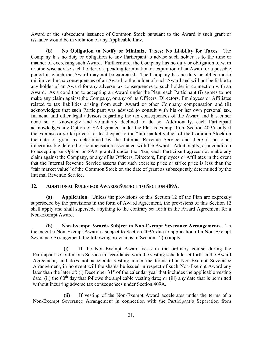 21. Award or the subsequent issuance of Common Stock pursuant to the Award if such grant or issuance would be in violation of any Applicable Law. (b) No Obligation to Notify or Minimize Taxes; No Liability for Taxes. The Company has no duty or obligation to any Participant to advise such holder as to the time or manner of exercising such Award. Furthermore, the Company has no duty or obligation to warn or otherwise advise such holder of a pending termination or expiration of an Award or a possible period in which the Award may not be exercised. The Company has no duty or obligation to minimize the tax consequences of an Award to the holder of such Award and will not be liable to any holder of an Award for any adverse tax consequences to such holder in connection with an Award. As a condition to accepting an Award under the Plan, each Participant (i) agrees to not make any claim against the Company, or any of its Officers, Directors, Employees or Affiliates related to tax liabilities arising from such Award or other Company compensation and (ii) acknowledges that such Participant was advised to consult with his or her own personal tax, financial and other legal advisors regarding the tax consequences of the Award and has either done so or knowingly and voluntarily declined to do so. Additionally, each Participant acknowledges any Option or SAR granted under the Plan is exempt from Section 409A only if the exercise or strike price is at least equal to the “fair market value” of the Common Stock on the date of grant as determined by the Internal Revenue Service and there is no other impermissible deferral of compensation associated with the Award. Additionally, as a condition to accepting an Option or SAR granted under the Plan, each Participant agrees not make any claim against the Company, or any of its Officers, Directors, Employees or Affiliates in the event that the Internal Revenue Service asserts that such exercise price or strike price is less than the “fair market value” of the Common Stock on the date of grant as subsequently determined by the Internal Revenue Service. 12. ADDITIONAL RULES FOR AWARDS SUBJECT TO SECTION 409A. (a) Application. Unless the provisions of this Section 12 of the Plan are expressly superseded by the provisions in the form of Award Agreement, the provisions of this Section 12 shall apply and shall supersede anything to the contrary set forth in the Award Agreement for a Non-Exempt Award. (b) Non-Exempt Awards Subject to Non-Exempt Severance Arrangements. To the extent a Non-Exempt Award is subject to Section 409A due to application of a Non-Exempt Severance Arrangement, the following provisions of Section 12(b) apply. (i) If the Non-Exempt Award vests in the ordinary course during the Participant’s Continuous Service in accordance with the vesting schedule set forth in the Award Agreement, and does not accelerate vesting under the terms of a Non-Exempt Severance Arrangement, in no event will the shares be issued in respect of such Non-Exempt Award any later than the later of: (i) December 31st of the calendar year that includes the applicable vesting date; (ii) the 60th day that follows the applicable vesting date; or (iii) any date that is permitted without incurring adverse tax consequences under Section 409A. (ii) If vesting of the Non-Exempt Award accelerates under the terms of a Non-Exempt Severance Arrangement in connection with the Participant’s Separation from