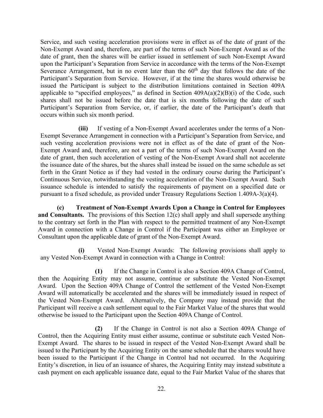 22. Service, and such vesting acceleration provisions were in effect as of the date of grant of the Non-Exempt Award and, therefore, are part of the terms of such Non-Exempt Award as of the date of grant, then the shares will be earlier issued in settlement of such Non-Exempt Award upon the Participant’s Separation from Service in accordance with the terms of the Non-Exempt Severance Arrangement, but in no event later than the 60th day that follows the date of the Participant’s Separation from Service. However, if at the time the shares would otherwise be issued the Participant is subject to the distribution limitations contained in Section 409A applicable to “specified employees,” as defined in Section 409A(a)(2)(B)(i) of the Code, such shares shall not be issued before the date that is six months following the date of such Participant’s Separation from Service, or, if earlier, the date of the Participant’s death that occurs within such six month period. (iii) If vesting of a Non-Exempt Award accelerates under the terms of a Non- Exempt Severance Arrangement in connection with a Participant’s Separation from Service, and such vesting acceleration provisions were not in effect as of the date of grant of the Non- Exempt Award and, therefore, are not a part of the terms of such Non-Exempt Award on the date of grant, then such acceleration of vesting of the Non-Exempt Award shall not accelerate the issuance date of the shares, but the shares shall instead be issued on the same schedule as set forth in the Grant Notice as if they had vested in the ordinary course during the Participant’s Continuous Service, notwithstanding the vesting acceleration of the Non-Exempt Award. Such issuance schedule is intended to satisfy the requirements of payment on a specified date or pursuant to a fixed schedule, as provided under Treasury Regulations Section 1.409A-3(a)(4). (c) Treatment of Non-Exempt Awards Upon a Change in Control for Employees and Consultants. The provisions of this Section 12(c) shall apply and shall supersede anything to the contrary set forth in the Plan with respect to the permitted treatment of any Non-Exempt Award in connection with a Change in Control if the Participant was either an Employee or Consultant upon the applicable date of grant of the Non-Exempt Award. (i) Vested Non-Exempt Awards: The following provisions shall apply to any Vested Non-Exempt Award in connection with a Change in Control: (1) If the Change in Control is also a Section 409A Change of Control, then the Acquiring Entity may not assume, continue or substitute the Vested Non-Exempt Award. Upon the Section 409A Change of Control the settlement of the Vested Non-Exempt Award will automatically be accelerated and the shares will be immediately issued in respect of the Vested Non-Exempt Award. Alternatively, the Company may instead provide that the Participant will receive a cash settlement equal to the Fair Market Value of the shares that would otherwise be issued to the Participant upon the Section 409A Change of Control. (2) If the Change in Control is not also a Section 409A Change of Control, then the Acquiring Entity must either assume, continue or substitute each Vested Non- Exempt Award. The shares to be issued in respect of the Vested Non-Exempt Award shall be issued to the Participant by the Acquiring Entity on the same schedule that the shares would have been issued to the Participant if the Change in Control had not occurred. In the Acquiring Entity’s discretion, in lieu of an issuance of shares, the Acquiring Entity may instead substitute a cash payment on each applicable issuance date, equal to the Fair Market Value of the shares that