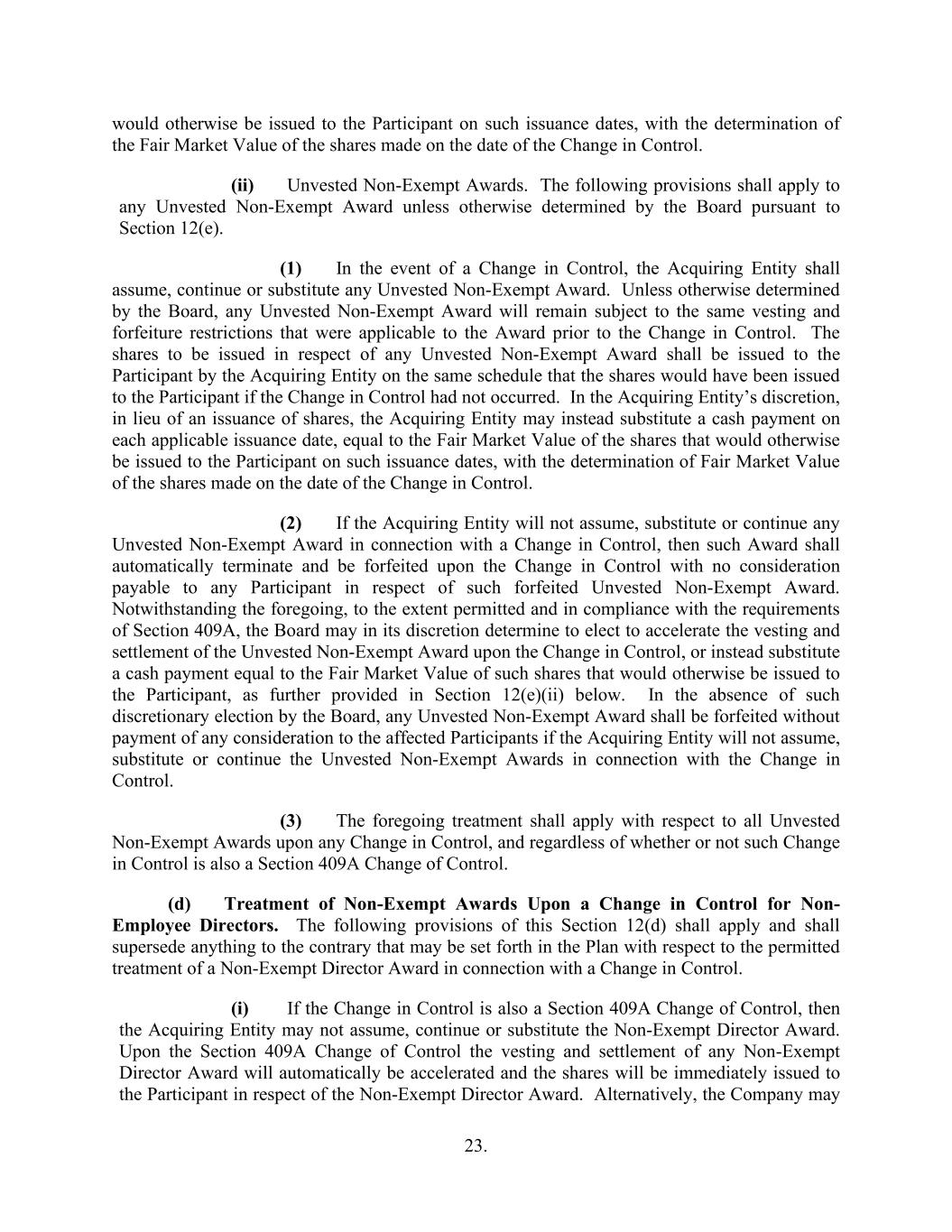 23. would otherwise be issued to the Participant on such issuance dates, with the determination of the Fair Market Value of the shares made on the date of the Change in Control. (ii) Unvested Non-Exempt Awards. The following provisions shall apply to any Unvested Non-Exempt Award unless otherwise determined by the Board pursuant to Section 12(e). (1) In the event of a Change in Control, the Acquiring Entity shall assume, continue or substitute any Unvested Non-Exempt Award. Unless otherwise determined by the Board, any Unvested Non-Exempt Award will remain subject to the same vesting and forfeiture restrictions that were applicable to the Award prior to the Change in Control. The shares to be issued in respect of any Unvested Non-Exempt Award shall be issued to the Participant by the Acquiring Entity on the same schedule that the shares would have been issued to the Participant if the Change in Control had not occurred. In the Acquiring Entity’s discretion, in lieu of an issuance of shares, the Acquiring Entity may instead substitute a cash payment on each applicable issuance date, equal to the Fair Market Value of the shares that would otherwise be issued to the Participant on such issuance dates, with the determination of Fair Market Value of the shares made on the date of the Change in Control. (2) If the Acquiring Entity will not assume, substitute or continue any Unvested Non-Exempt Award in connection with a Change in Control, then such Award shall automatically terminate and be forfeited upon the Change in Control with no consideration payable to any Participant in respect of such forfeited Unvested Non-Exempt Award. Notwithstanding the foregoing, to the extent permitted and in compliance with the requirements of Section 409A, the Board may in its discretion determine to elect to accelerate the vesting and settlement of the Unvested Non-Exempt Award upon the Change in Control, or instead substitute a cash payment equal to the Fair Market Value of such shares that would otherwise be issued to the Participant, as further provided in Section 12(e)(ii) below. In the absence of such discretionary election by the Board, any Unvested Non-Exempt Award shall be forfeited without payment of any consideration to the affected Participants if the Acquiring Entity will not assume, substitute or continue the Unvested Non-Exempt Awards in connection with the Change in Control. (3) The foregoing treatment shall apply with respect to all Unvested Non-Exempt Awards upon any Change in Control, and regardless of whether or not such Change in Control is also a Section 409A Change of Control. (d) Treatment of Non-Exempt Awards Upon a Change in Control for Non- Employee Directors. The following provisions of this Section 12(d) shall apply and shall supersede anything to the contrary that may be set forth in the Plan with respect to the permitted treatment of a Non-Exempt Director Award in connection with a Change in Control. (i) If the Change in Control is also a Section 409A Change of Control, then the Acquiring Entity may not assume, continue or substitute the Non-Exempt Director Award. Upon the Section 409A Change of Control the vesting and settlement of any Non-Exempt Director Award will automatically be accelerated and the shares will be immediately issued to the Participant in respect of the Non-Exempt Director Award. Alternatively, the Company may