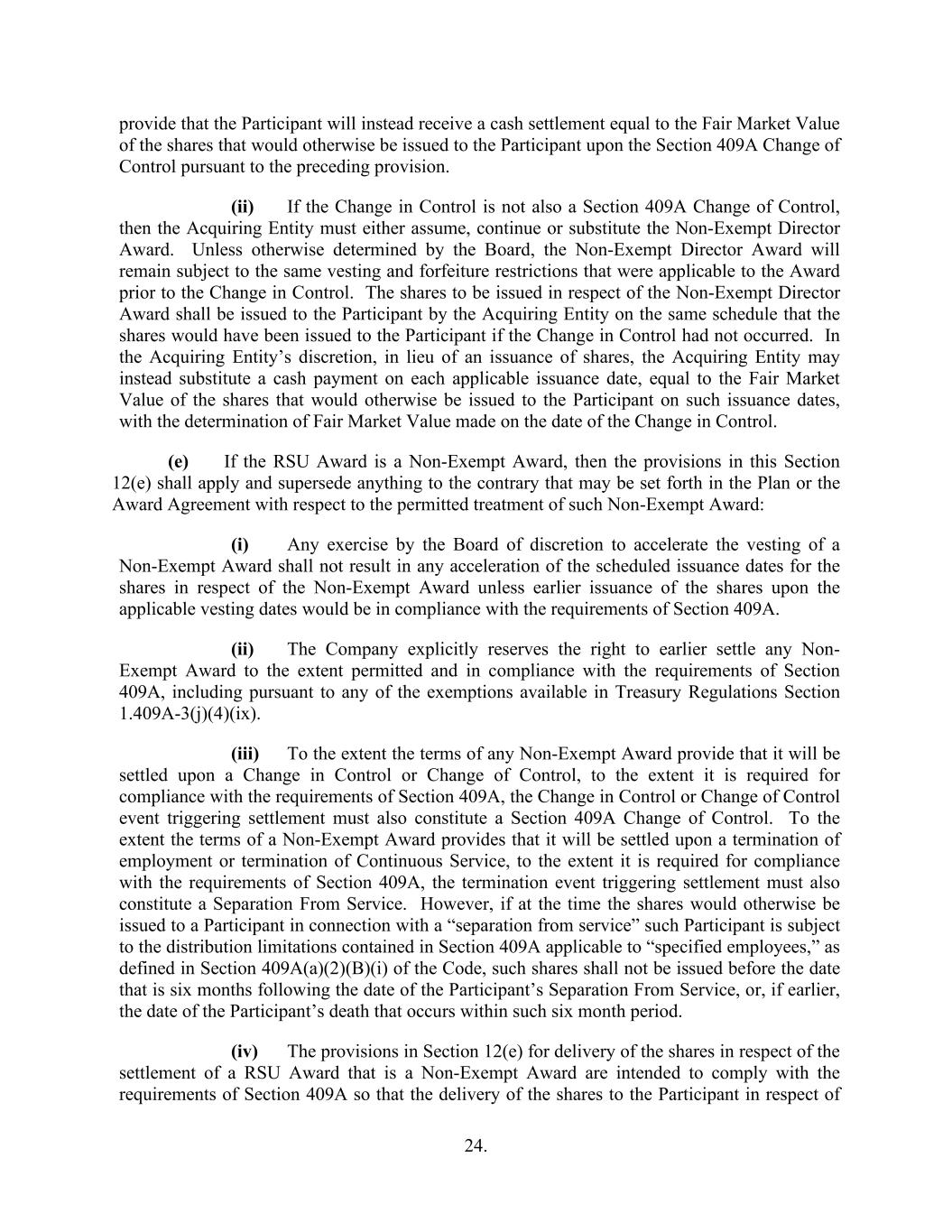 24. provide that the Participant will instead receive a cash settlement equal to the Fair Market Value of the shares that would otherwise be issued to the Participant upon the Section 409A Change of Control pursuant to the preceding provision. (ii) If the Change in Control is not also a Section 409A Change of Control, then the Acquiring Entity must either assume, continue or substitute the Non-Exempt Director Award. Unless otherwise determined by the Board, the Non-Exempt Director Award will remain subject to the same vesting and forfeiture restrictions that were applicable to the Award prior to the Change in Control. The shares to be issued in respect of the Non-Exempt Director Award shall be issued to the Participant by the Acquiring Entity on the same schedule that the shares would have been issued to the Participant if the Change in Control had not occurred. In the Acquiring Entity’s discretion, in lieu of an issuance of shares, the Acquiring Entity may instead substitute a cash payment on each applicable issuance date, equal to the Fair Market Value of the shares that would otherwise be issued to the Participant on such issuance dates, with the determination of Fair Market Value made on the date of the Change in Control. (e) If the RSU Award is a Non-Exempt Award, then the provisions in this Section 12(e) shall apply and supersede anything to the contrary that may be set forth in the Plan or the Award Agreement with respect to the permitted treatment of such Non-Exempt Award: (i) Any exercise by the Board of discretion to accelerate the vesting of a Non-Exempt Award shall not result in any acceleration of the scheduled issuance dates for the shares in respect of the Non-Exempt Award unless earlier issuance of the shares upon the applicable vesting dates would be in compliance with the requirements of Section 409A. (ii) The Company explicitly reserves the right to earlier settle any Non- Exempt Award to the extent permitted and in compliance with the requirements of Section 409A, including pursuant to any of the exemptions available in Treasury Regulations Section 1.409A-3(j)(4)(ix). (iii) To the extent the terms of any Non-Exempt Award provide that it will be settled upon a Change in Control or Change of Control, to the extent it is required for compliance with the requirements of Section 409A, the Change in Control or Change of Control event triggering settlement must also constitute a Section 409A Change of Control. To the extent the terms of a Non-Exempt Award provides that it will be settled upon a termination of employment or termination of Continuous Service, to the extent it is required for compliance with the requirements of Section 409A, the termination event triggering settlement must also constitute a Separation From Service. However, if at the time the shares would otherwise be issued to a Participant in connection with a “separation from service” such Participant is subject to the distribution limitations contained in Section 409A applicable to “specified employees,” as defined in Section 409A(a)(2)(B)(i) of the Code, such shares shall not be issued before the date that is six months following the date of the Participant’s Separation From Service, or, if earlier, the date of the Participant’s death that occurs within such six month period. (iv) The provisions in Section 12(e) for delivery of the shares in respect of the settlement of a RSU Award that is a Non-Exempt Award are intended to comply with the requirements of Section 409A so that the delivery of the shares to the Participant in respect of