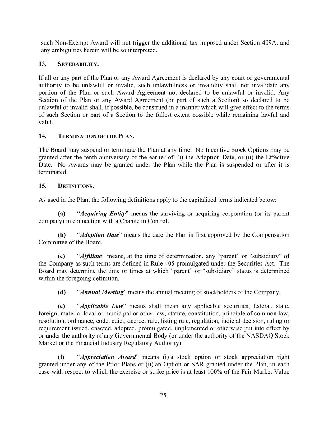 25. such Non-Exempt Award will not trigger the additional tax imposed under Section 409A, and any ambiguities herein will be so interpreted. 13. SEVERABILITY. If all or any part of the Plan or any Award Agreement is declared by any court or governmental authority to be unlawful or invalid, such unlawfulness or invalidity shall not invalidate any portion of the Plan or such Award Agreement not declared to be unlawful or invalid. Any Section of the Plan or any Award Agreement (or part of such a Section) so declared to be unlawful or invalid shall, if possible, be construed in a manner which will give effect to the terms of such Section or part of a Section to the fullest extent possible while remaining lawful and valid. 14. TERMINATION OF THE PLAN. The Board may suspend or terminate the Plan at any time. No Incentive Stock Options may be granted after the tenth anniversary of the earlier of: (i) the Adoption Date, or (ii) the Effective Date. No Awards may be granted under the Plan while the Plan is suspended or after it is terminated. 15. DEFINITIONS. As used in the Plan, the following definitions apply to the capitalized terms indicated below: (a) “Acquiring Entity” means the surviving or acquiring corporation (or its parent company) in connection with a Change in Control. (b) “Adoption Date” means the date the Plan is first approved by the Compensation Committee of the Board. (c) “Affiliate” means, at the time of determination, any “parent” or “subsidiary” of the Company as such terms are defined in Rule 405 promulgated under the Securities Act. The Board may determine the time or times at which “parent” or “subsidiary” status is determined within the foregoing definition. (d) “Annual Meeting” means the annual meeting of stockholders of the Company. (e) “Applicable Law” means shall mean any applicable securities, federal, state, foreign, material local or municipal or other law, statute, constitution, principle of common law, resolution, ordinance, code, edict, decree, rule, listing rule, regulation, judicial decision, ruling or requirement issued, enacted, adopted, promulgated, implemented or otherwise put into effect by or under the authority of any Governmental Body (or under the authority of the NASDAQ Stock Market or the Financial Industry Regulatory Authority). (f) “Appreciation Award” means (i) a stock option or stock appreciation right granted under any of the Prior Plans or (ii) an Option or SAR granted under the Plan, in each case with respect to which the exercise or strike price is at least 100% of the Fair Market Value
