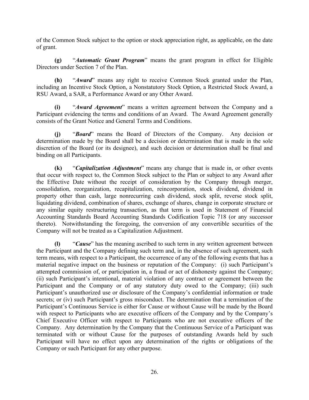 26. of the Common Stock subject to the option or stock appreciation right, as applicable, on the date of grant. (g) “Automatic Grant Program” means the grant program in effect for Eligible Directors under Section 7 of the Plan. (h) “Award” means any right to receive Common Stock granted under the Plan, including an Incentive Stock Option, a Nonstatutory Stock Option, a Restricted Stock Award, a RSU Award, a SAR, a Performance Award or any Other Award. (i) “Award Agreement” means a written agreement between the Company and a Participant evidencing the terms and conditions of an Award. The Award Agreement generally consists of the Grant Notice and General Terms and Conditions. (j) “Board” means the Board of Directors of the Company. Any decision or determination made by the Board shall be a decision or determination that is made in the sole discretion of the Board (or its designee), and such decision or determination shall be final and binding on all Participants. (k) “Capitalization Adjustment” means any change that is made in, or other events that occur with respect to, the Common Stock subject to the Plan or subject to any Award after the Effective Date without the receipt of consideration by the Company through merger, consolidation, reorganization, recapitalization, reincorporation, stock dividend, dividend in property other than cash, large nonrecurring cash dividend, stock split, reverse stock split, liquidating dividend, combination of shares, exchange of shares, change in corporate structure or any similar equity restructuring transaction, as that term is used in Statement of Financial Accounting Standards Board Accounting Standards Codification Topic 718 (or any successor thereto). Notwithstanding the foregoing, the conversion of any convertible securities of the Company will not be treated as a Capitalization Adjustment. (l) “Cause” has the meaning ascribed to such term in any written agreement between the Participant and the Company defining such term and, in the absence of such agreement, such term means, with respect to a Participant, the occurrence of any of the following events that has a material negative impact on the business or reputation of the Company: (i) such Participant’s attempted commission of, or participation in, a fraud or act of dishonesty against the Company; (ii) such Participant’s intentional, material violation of any contract or agreement between the Participant and the Company or of any statutory duty owed to the Company; (iii) such Participant’s unauthorized use or disclosure of the Company’s confidential information or trade secrets; or (iv) such Participant’s gross misconduct. The determination that a termination of the Participant’s Continuous Service is either for Cause or without Cause will be made by the Board with respect to Participants who are executive officers of the Company and by the Company’s Chief Executive Officer with respect to Participants who are not executive officers of the Company. Any determination by the Company that the Continuous Service of a Participant was terminated with or without Cause for the purposes of outstanding Awards held by such Participant will have no effect upon any determination of the rights or obligations of the Company or such Participant for any other purpose.