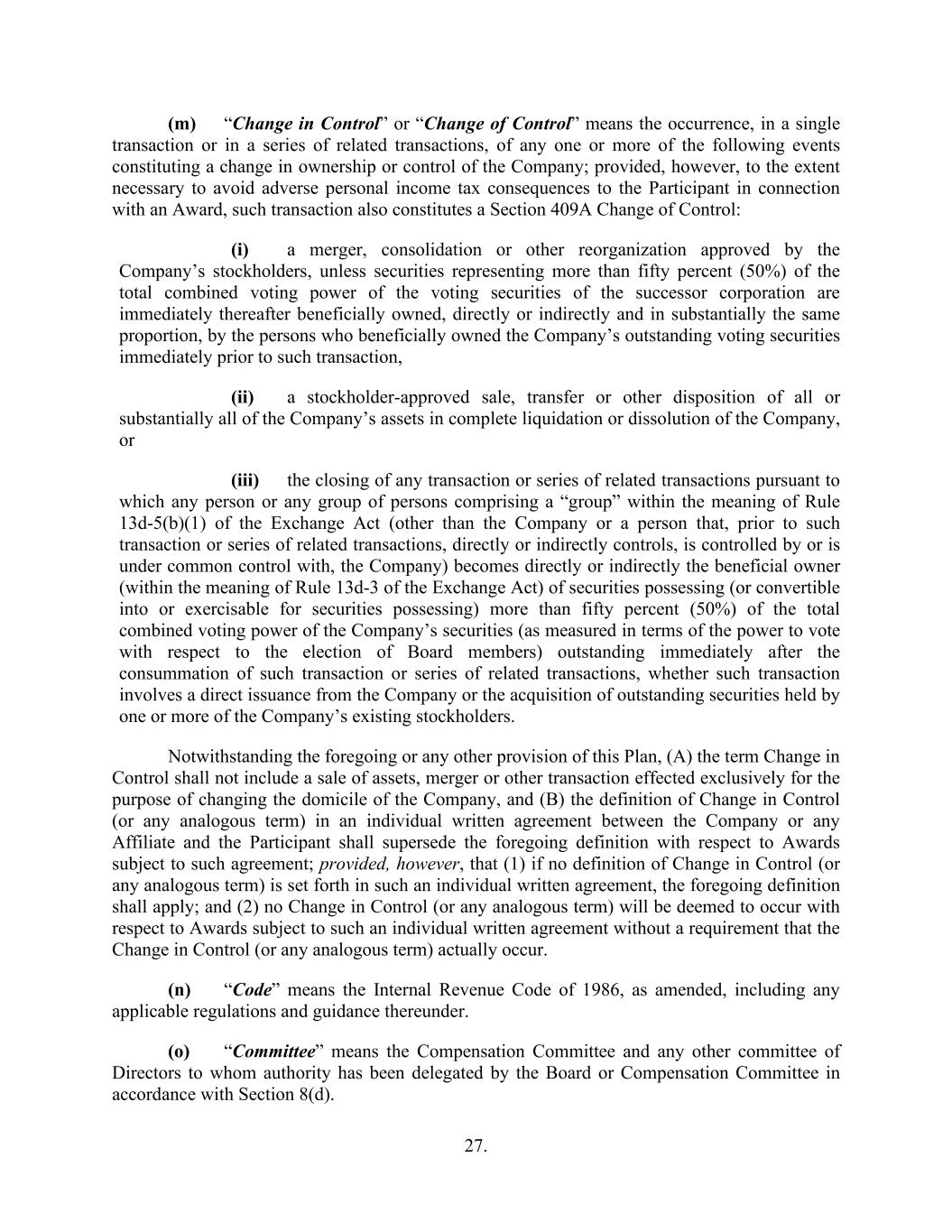 27. (m) “Change in Control” or “Change of Control” means the occurrence, in a single transaction or in a series of related transactions, of any one or more of the following events constituting a change in ownership or control of the Company; provided, however, to the extent necessary to avoid adverse personal income tax consequences to the Participant in connection with an Award, such transaction also constitutes a Section 409A Change of Control: (i) a merger, consolidation or other reorganization approved by the Company’s stockholders, unless securities representing more than fifty percent (50%) of the total combined voting power of the voting securities of the successor corporation are immediately thereafter beneficially owned, directly or indirectly and in substantially the same proportion, by the persons who beneficially owned the Company’s outstanding voting securities immediately prior to such transaction, (ii) a stockholder-approved sale, transfer or other disposition of all or substantially all of the Company’s assets in complete liquidation or dissolution of the Company, or (iii) the closing of any transaction or series of related transactions pursuant to which any person or any group of persons comprising a “group” within the meaning of Rule 13d-5(b)(1) of the Exchange Act (other than the Company or a person that, prior to such transaction or series of related transactions, directly or indirectly controls, is controlled by or is under common control with, the Company) becomes directly or indirectly the beneficial owner (within the meaning of Rule 13d-3 of the Exchange Act) of securities possessing (or convertible into or exercisable for securities possessing) more than fifty percent (50%) of the total combined voting power of the Company’s securities (as measured in terms of the power to vote with respect to the election of Board members) outstanding immediately after the consummation of such transaction or series of related transactions, whether such transaction involves a direct issuance from the Company or the acquisition of outstanding securities held by one or more of the Company’s existing stockholders. Notwithstanding the foregoing or any other provision of this Plan, (A) the term Change in Control shall not include a sale of assets, merger or other transaction effected exclusively for the purpose of changing the domicile of the Company, and (B) the definition of Change in Control (or any analogous term) in an individual written agreement between the Company or any Affiliate and the Participant shall supersede the foregoing definition with respect to Awards subject to such agreement; provided, however, that (1) if no definition of Change in Control (or any analogous term) is set forth in such an individual written agreement, the foregoing definition shall apply; and (2) no Change in Control (or any analogous term) will be deemed to occur with respect to Awards subject to such an individual written agreement without a requirement that the Change in Control (or any analogous term) actually occur. (n) “Code” means the Internal Revenue Code of 1986, as amended, including any applicable regulations and guidance thereunder. (o) “Committee” means the Compensation Committee and any other committee of Directors to whom authority has been delegated by the Board or Compensation Committee in accordance with Section 8(d).