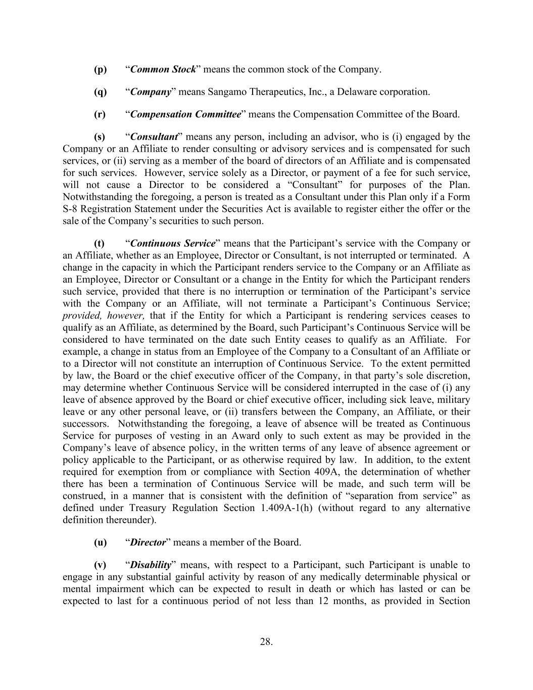 28. (p) “Common Stock” means the common stock of the Company. (q) “Company” means Sangamo Therapeutics, Inc., a Delaware corporation. (r) “Compensation Committee” means the Compensation Committee of the Board. (s) “Consultant” means any person, including an advisor, who is (i) engaged by the Company or an Affiliate to render consulting or advisory services and is compensated for such services, or (ii) serving as a member of the board of directors of an Affiliate and is compensated for such services. However, service solely as a Director, or payment of a fee for such service, will not cause a Director to be considered a “Consultant” for purposes of the Plan. Notwithstanding the foregoing, a person is treated as a Consultant under this Plan only if a Form S-8 Registration Statement under the Securities Act is available to register either the offer or the sale of the Company’s securities to such person. (t) “Continuous Service” means that the Participant’s service with the Company or an Affiliate, whether as an Employee, Director or Consultant, is not interrupted or terminated. A change in the capacity in which the Participant renders service to the Company or an Affiliate as an Employee, Director or Consultant or a change in the Entity for which the Participant renders such service, provided that there is no interruption or termination of the Participant’s service with the Company or an Affiliate, will not terminate a Participant’s Continuous Service; provided, however, that if the Entity for which a Participant is rendering services ceases to qualify as an Affiliate, as determined by the Board, such Participant’s Continuous Service will be considered to have terminated on the date such Entity ceases to qualify as an Affiliate. For example, a change in status from an Employee of the Company to a Consultant of an Affiliate or to a Director will not constitute an interruption of Continuous Service. To the extent permitted by law, the Board or the chief executive officer of the Company, in that party’s sole discretion, may determine whether Continuous Service will be considered interrupted in the case of (i) any leave of absence approved by the Board or chief executive officer, including sick leave, military leave or any other personal leave, or (ii) transfers between the Company, an Affiliate, or their successors. Notwithstanding the foregoing, a leave of absence will be treated as Continuous Service for purposes of vesting in an Award only to such extent as may be provided in the Company’s leave of absence policy, in the written terms of any leave of absence agreement or policy applicable to the Participant, or as otherwise required by law. In addition, to the extent required for exemption from or compliance with Section 409A, the determination of whether there has been a termination of Continuous Service will be made, and such term will be construed, in a manner that is consistent with the definition of “separation from service” as defined under Treasury Regulation Section 1.409A-1(h) (without regard to any alternative definition thereunder). (u) “Director” means a member of the Board. (v) “Disability” means, with respect to a Participant, such Participant is unable to engage in any substantial gainful activity by reason of any medically determinable physical or mental impairment which can be expected to result in death or which has lasted or can be expected to last for a continuous period of not less than 12 months, as provided in Section