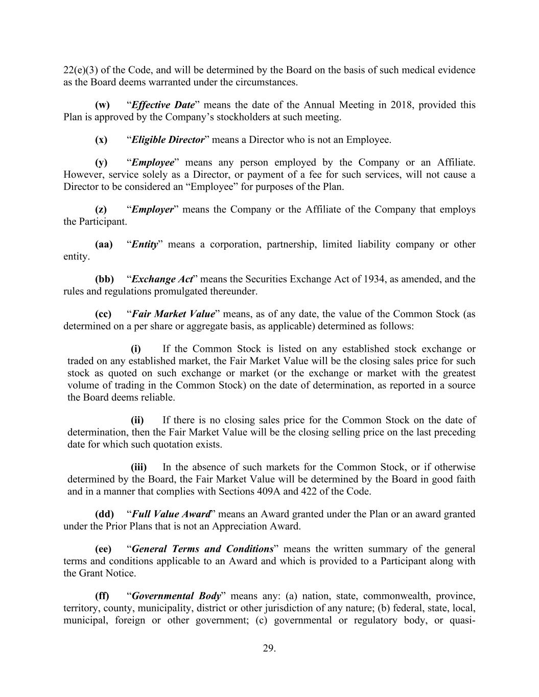 29. 22(e)(3) of the Code, and will be determined by the Board on the basis of such medical evidence as the Board deems warranted under the circumstances. (w) “Effective Date” means the date of the Annual Meeting in 2018, provided this Plan is approved by the Company’s stockholders at such meeting. (x) “Eligible Director” means a Director who is not an Employee. (y) “Employee” means any person employed by the Company or an Affiliate. However, service solely as a Director, or payment of a fee for such services, will not cause a Director to be considered an “Employee” for purposes of the Plan. (z) “Employer” means the Company or the Affiliate of the Company that employs the Participant. (aa) “Entity” means a corporation, partnership, limited liability company or other entity. (bb) “Exchange Act” means the Securities Exchange Act of 1934, as amended, and the rules and regulations promulgated thereunder. (cc) “Fair Market Value” means, as of any date, the value of the Common Stock (as determined on a per share or aggregate basis, as applicable) determined as follows: (i) If the Common Stock is listed on any established stock exchange or traded on any established market, the Fair Market Value will be the closing sales price for such stock as quoted on such exchange or market (or the exchange or market with the greatest volume of trading in the Common Stock) on the date of determination, as reported in a source the Board deems reliable. (ii) If there is no closing sales price for the Common Stock on the date of determination, then the Fair Market Value will be the closing selling price on the last preceding date for which such quotation exists. (iii) In the absence of such markets for the Common Stock, or if otherwise determined by the Board, the Fair Market Value will be determined by the Board in good faith and in a manner that complies with Sections 409A and 422 of the Code. (dd) “Full Value Award” means an Award granted under the Plan or an award granted under the Prior Plans that is not an Appreciation Award. (ee) “General Terms and Conditions” means the written summary of the general terms and conditions applicable to an Award and which is provided to a Participant along with the Grant Notice. (ff) “Governmental Body” means any: (a) nation, state, commonwealth, province, territory, county, municipality, district or other jurisdiction of any nature; (b) federal, state, local, municipal, foreign or other government; (c) governmental or regulatory body, or quasi-