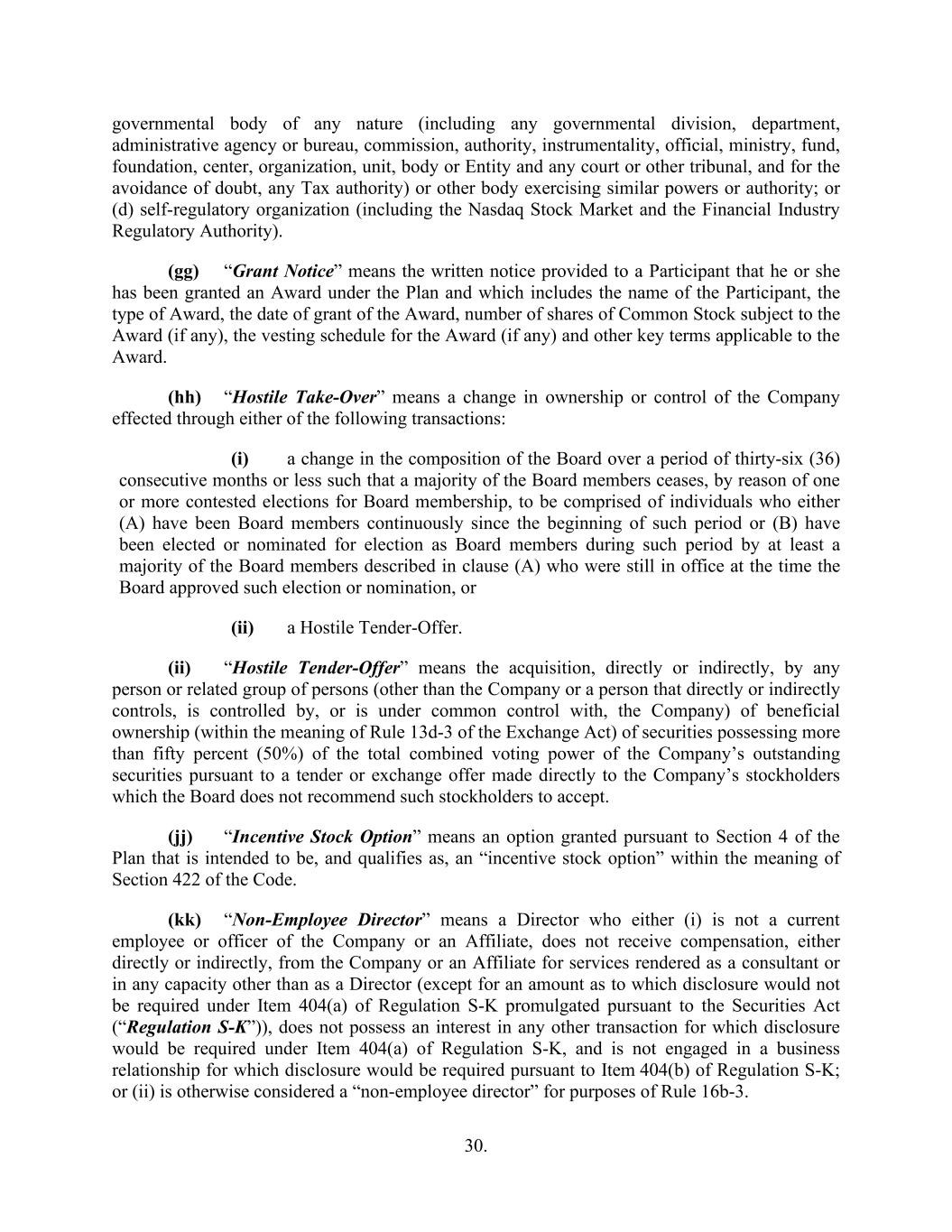 30. governmental body of any nature (including any governmental division, department, administrative agency or bureau, commission, authority, instrumentality, official, ministry, fund, foundation, center, organization, unit, body or Entity and any court or other tribunal, and for the avoidance of doubt, any Tax authority) or other body exercising similar powers or authority; or (d) self-regulatory organization (including the Nasdaq Stock Market and the Financial Industry Regulatory Authority). (gg) “Grant Notice” means the written notice provided to a Participant that he or she has been granted an Award under the Plan and which includes the name of the Participant, the type of Award, the date of grant of the Award, number of shares of Common Stock subject to the Award (if any), the vesting schedule for the Award (if any) and other key terms applicable to the Award. (hh) “Hostile Take-Over” means a change in ownership or control of the Company effected through either of the following transactions: (i) a change in the composition of the Board over a period of thirty-six (36) consecutive months or less such that a majority of the Board members ceases, by reason of one or more contested elections for Board membership, to be comprised of individuals who either (A) have been Board members continuously since the beginning of such period or (B) have been elected or nominated for election as Board members during such period by at least a majority of the Board members described in clause (A) who were still in office at the time the Board approved such election or nomination, or (ii) a Hostile Tender-Offer. (ii) “Hostile Tender-Offer” means the acquisition, directly or indirectly, by any person or related group of persons (other than the Company or a person that directly or indirectly controls, is controlled by, or is under common control with, the Company) of beneficial ownership (within the meaning of Rule 13d-3 of the Exchange Act) of securities possessing more than fifty percent (50%) of the total combined voting power of the Company’s outstanding securities pursuant to a tender or exchange offer made directly to the Company’s stockholders which the Board does not recommend such stockholders to accept. (jj) “Incentive Stock Option” means an option granted pursuant to Section 4 of the Plan that is intended to be, and qualifies as, an “incentive stock option” within the meaning of Section 422 of the Code. (kk) “Non-Employee Director” means a Director who either (i) is not a current employee or officer of the Company or an Affiliate, does not receive compensation, either directly or indirectly, from the Company or an Affiliate for services rendered as a consultant or in any capacity other than as a Director (except for an amount as to which disclosure would not be required under Item 404(a) of Regulation S-K promulgated pursuant to the Securities Act (“Regulation S-K”)), does not possess an interest in any other transaction for which disclosure would be required under Item 404(a) of Regulation S-K, and is not engaged in a business relationship for which disclosure would be required pursuant to Item 404(b) of Regulation S-K; or (ii) is otherwise considered a “non-employee director” for purposes of Rule 16b-3.