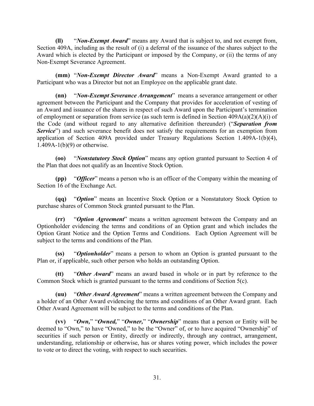 31. (ll) “Non-Exempt Award” means any Award that is subject to, and not exempt from, Section 409A, including as the result of (i) a deferral of the issuance of the shares subject to the Award which is elected by the Participant or imposed by the Company, or (ii) the terms of any Non-Exempt Severance Agreement. (mm) “Non-Exempt Director Award” means a Non-Exempt Award granted to a Participant who was a Director but not an Employee on the applicable grant date. (nn) “Non-Exempt Severance Arrangement” means a severance arrangement or other agreement between the Participant and the Company that provides for acceleration of vesting of an Award and issuance of the shares in respect of such Award upon the Participant’s termination of employment or separation from service (as such term is defined in Section 409A(a)(2)(A)(i) of the Code (and without regard to any alternative definition thereunder) (“Separation from Service”) and such severance benefit does not satisfy the requirements for an exemption from application of Section 409A provided under Treasury Regulations Section 1.409A-1(b)(4), 1.409A-1(b)(9) or otherwise. (oo) “Nonstatutory Stock Option” means any option granted pursuant to Section 4 of the Plan that does not qualify as an Incentive Stock Option. (pp) “Officer” means a person who is an officer of the Company within the meaning of Section 16 of the Exchange Act. (qq) “Option” means an Incentive Stock Option or a Nonstatutory Stock Option to purchase shares of Common Stock granted pursuant to the Plan. (rr) “Option Agreement” means a written agreement between the Company and an Optionholder evidencing the terms and conditions of an Option grant and which includes the Option Grant Notice and the Option Terms and Conditions. Each Option Agreement will be subject to the terms and conditions of the Plan. (ss) “Optionholder” means a person to whom an Option is granted pursuant to the Plan or, if applicable, such other person who holds an outstanding Option. (tt) “Other Award” means an award based in whole or in part by reference to the Common Stock which is granted pursuant to the terms and conditions of Section 5(c). (uu) “Other Award Agreement” means a written agreement between the Company and a holder of an Other Award evidencing the terms and conditions of an Other Award grant. Each Other Award Agreement will be subject to the terms and conditions of the Plan. (vv) “Own,” “Owned,” “Owner,” “Ownership” means that a person or Entity will be deemed to “Own,” to have “Owned,” to be the “Owner” of, or to have acquired “Ownership” of securities if such person or Entity, directly or indirectly, through any contract, arrangement, understanding, relationship or otherwise, has or shares voting power, which includes the power to vote or to direct the voting, with respect to such securities.