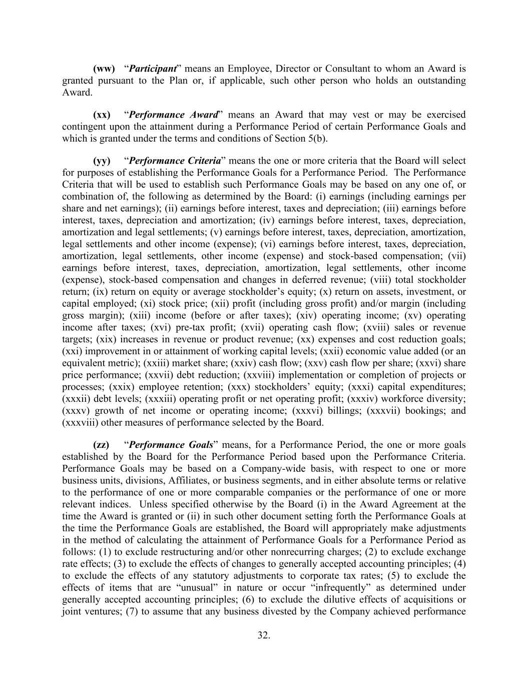 32. (ww) “Participant” means an Employee, Director or Consultant to whom an Award is granted pursuant to the Plan or, if applicable, such other person who holds an outstanding Award. (xx) “Performance Award” means an Award that may vest or may be exercised contingent upon the attainment during a Performance Period of certain Performance Goals and which is granted under the terms and conditions of Section 5(b). (yy) “Performance Criteria” means the one or more criteria that the Board will select for purposes of establishing the Performance Goals for a Performance Period. The Performance Criteria that will be used to establish such Performance Goals may be based on any one of, or combination of, the following as determined by the Board: (i) earnings (including earnings per share and net earnings); (ii) earnings before interest, taxes and depreciation; (iii) earnings before interest, taxes, depreciation and amortization; (iv) earnings before interest, taxes, depreciation, amortization and legal settlements; (v) earnings before interest, taxes, depreciation, amortization, legal settlements and other income (expense); (vi) earnings before interest, taxes, depreciation, amortization, legal settlements, other income (expense) and stock-based compensation; (vii) earnings before interest, taxes, depreciation, amortization, legal settlements, other income (expense), stock-based compensation and changes in deferred revenue; (viii) total stockholder return; (ix) return on equity or average stockholder’s equity; (x) return on assets, investment, or capital employed; (xi) stock price; (xii) profit (including gross profit) and/or margin (including gross margin); (xiii) income (before or after taxes); (xiv) operating income; (xv) operating income after taxes; (xvi) pre-tax profit; (xvii) operating cash flow; (xviii) sales or revenue targets; (xix) increases in revenue or product revenue; (xx) expenses and cost reduction goals; (xxi) improvement in or attainment of working capital levels; (xxii) economic value added (or an equivalent metric); (xxiii) market share; (xxiv) cash flow; (xxv) cash flow per share; (xxvi) share price performance; (xxvii) debt reduction; (xxviii) implementation or completion of projects or processes; (xxix) employee retention; (xxx) stockholders’ equity; (xxxi) capital expenditures; (xxxii) debt levels; (xxxiii) operating profit or net operating profit; (xxxiv) workforce diversity; (xxxv) growth of net income or operating income; (xxxvi) billings; (xxxvii) bookings; and (xxxviii) other measures of performance selected by the Board. (zz) “Performance Goals” means, for a Performance Period, the one or more goals established by the Board for the Performance Period based upon the Performance Criteria. Performance Goals may be based on a Company-wide basis, with respect to one or more business units, divisions, Affiliates, or business segments, and in either absolute terms or relative to the performance of one or more comparable companies or the performance of one or more relevant indices. Unless specified otherwise by the Board (i) in the Award Agreement at the time the Award is granted or (ii) in such other document setting forth the Performance Goals at the time the Performance Goals are established, the Board will appropriately make adjustments in the method of calculating the attainment of Performance Goals for a Performance Period as follows: (1) to exclude restructuring and/or other nonrecurring charges; (2) to exclude exchange rate effects; (3) to exclude the effects of changes to generally accepted accounting principles; (4) to exclude the effects of any statutory adjustments to corporate tax rates; (5) to exclude the effects of items that are “unusual” in nature or occur “infrequently” as determined under generally accepted accounting principles; (6) to exclude the dilutive effects of acquisitions or joint ventures; (7) to assume that any business divested by the Company achieved performance