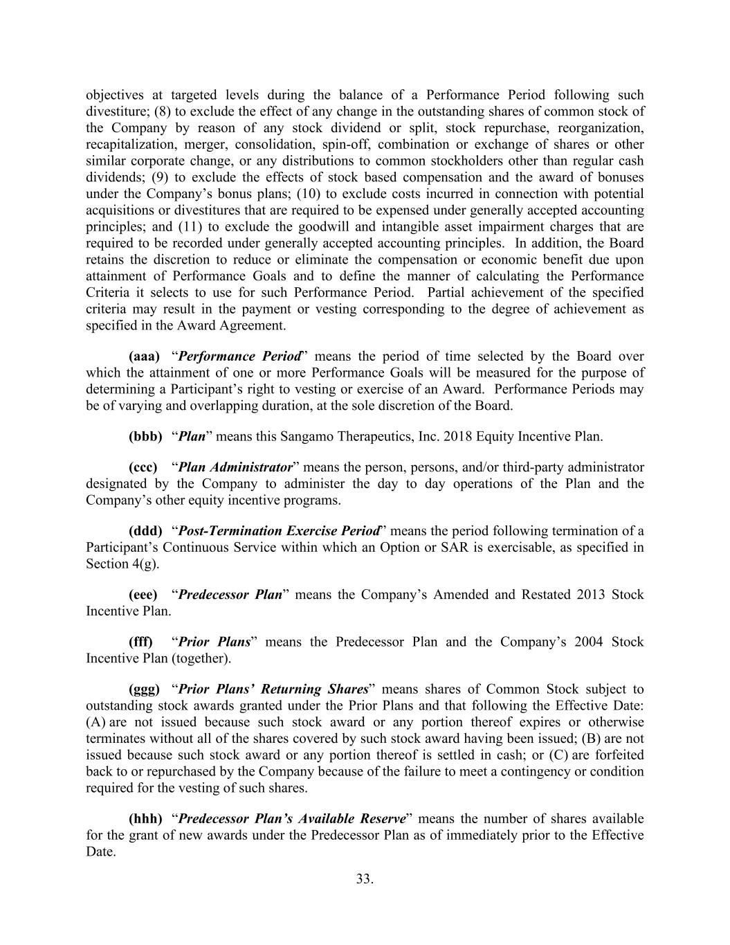 33. objectives at targeted levels during the balance of a Performance Period following such divestiture; (8) to exclude the effect of any change in the outstanding shares of common stock of the Company by reason of any stock dividend or split, stock repurchase, reorganization, recapitalization, merger, consolidation, spin-off, combination or exchange of shares or other similar corporate change, or any distributions to common stockholders other than regular cash dividends; (9) to exclude the effects of stock based compensation and the award of bonuses under the Company’s bonus plans; (10) to exclude costs incurred in connection with potential acquisitions or divestitures that are required to be expensed under generally accepted accounting principles; and (11) to exclude the goodwill and intangible asset impairment charges that are required to be recorded under generally accepted accounting principles. In addition, the Board retains the discretion to reduce or eliminate the compensation or economic benefit due upon attainment of Performance Goals and to define the manner of calculating the Performance Criteria it selects to use for such Performance Period. Partial achievement of the specified criteria may result in the payment or vesting corresponding to the degree of achievement as specified in the Award Agreement. (aaa) “Performance Period” means the period of time selected by the Board over which the attainment of one or more Performance Goals will be measured for the purpose of determining a Participant’s right to vesting or exercise of an Award. Performance Periods may be of varying and overlapping duration, at the sole discretion of the Board. (bbb) “Plan” means this Sangamo Therapeutics, Inc. 2018 Equity Incentive Plan. (ccc) “Plan Administrator” means the person, persons, and/or third-party administrator designated by the Company to administer the day to day operations of the Plan and the Company’s other equity incentive programs. (ddd) “Post-Termination Exercise Period” means the period following termination of a Participant’s Continuous Service within which an Option or SAR is exercisable, as specified in Section 4(g). (eee) “Predecessor Plan” means the Company’s Amended and Restated 2013 Stock Incentive Plan. (fff) “Prior Plans” means the Predecessor Plan and the Company’s 2004 Stock Incentive Plan (together). (ggg) “Prior Plans’ Returning Shares” means shares of Common Stock subject to outstanding stock awards granted under the Prior Plans and that following the Effective Date: (A) are not issued because such stock award or any portion thereof expires or otherwise terminates without all of the shares covered by such stock award having been issued; (B) are not issued because such stock award or any portion thereof is settled in cash; or (C) are forfeited back to or repurchased by the Company because of the failure to meet a contingency or condition required for the vesting of such shares. (hhh) “Predecessor Plan’s Available Reserve” means the number of shares available for the grant of new awards under the Predecessor Plan as of immediately prior to the Effective Date.