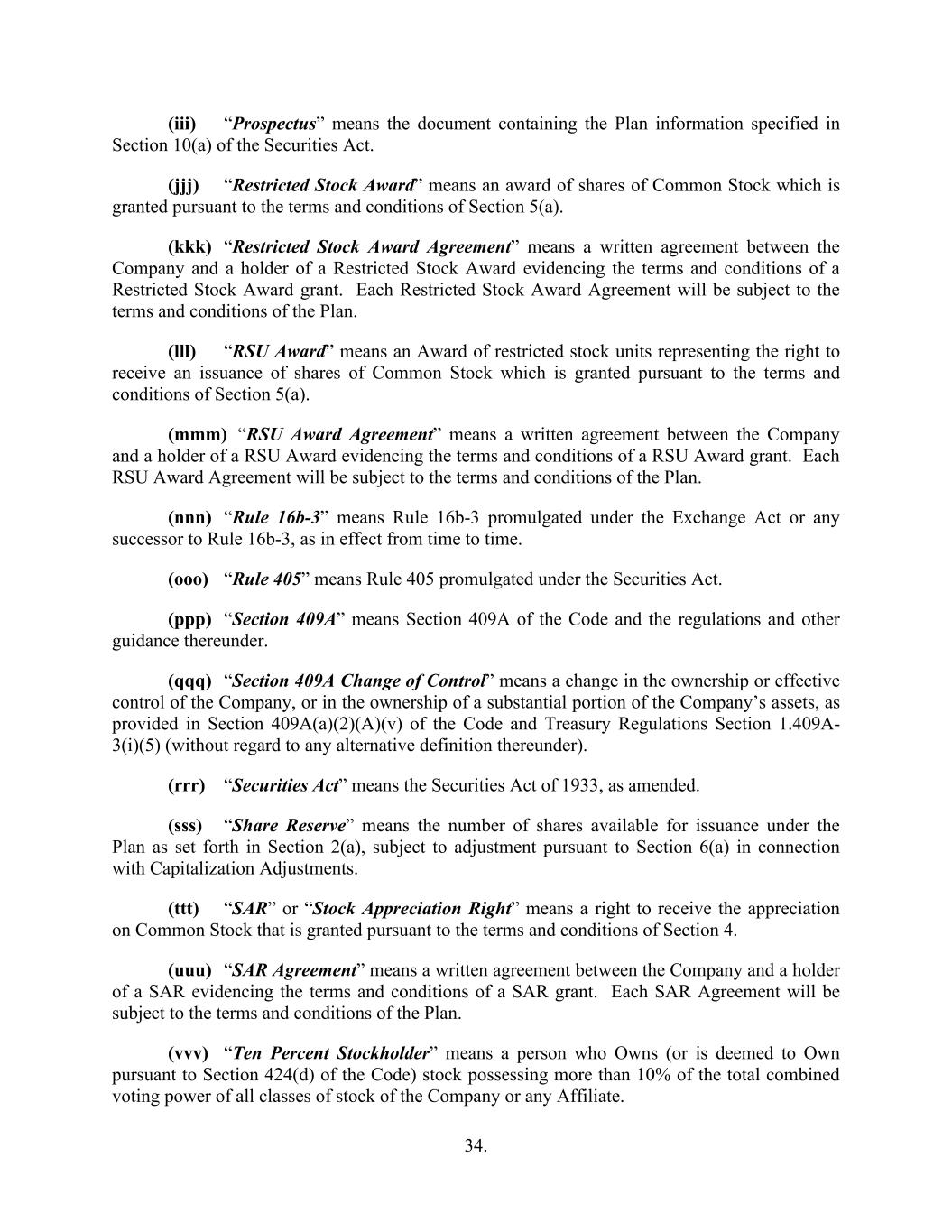 34. (iii) “Prospectus” means the document containing the Plan information specified in Section 10(a) of the Securities Act. (jjj) “Restricted Stock Award” means an award of shares of Common Stock which is granted pursuant to the terms and conditions of Section 5(a). (kkk) “Restricted Stock Award Agreement” means a written agreement between the Company and a holder of a Restricted Stock Award evidencing the terms and conditions of a Restricted Stock Award grant. Each Restricted Stock Award Agreement will be subject to the terms and conditions of the Plan. (lll) “RSU Award” means an Award of restricted stock units representing the right to receive an issuance of shares of Common Stock which is granted pursuant to the terms and conditions of Section 5(a). (mmm) “RSU Award Agreement” means a written agreement between the Company and a holder of a RSU Award evidencing the terms and conditions of a RSU Award grant. Each RSU Award Agreement will be subject to the terms and conditions of the Plan. (nnn) “Rule 16b-3” means Rule 16b-3 promulgated under the Exchange Act or any successor to Rule 16b-3, as in effect from time to time. (ooo) “Rule 405” means Rule 405 promulgated under the Securities Act. (ppp) “Section 409A” means Section 409A of the Code and the regulations and other guidance thereunder. (qqq) “Section 409A Change of Control” means a change in the ownership or effective control of the Company, or in the ownership of a substantial portion of the Company’s assets, as provided in Section 409A(a)(2)(A)(v) of the Code and Treasury Regulations Section 1.409A- 3(i)(5) (without regard to any alternative definition thereunder). (rrr) “Securities Act” means the Securities Act of 1933, as amended. (sss) “Share Reserve” means the number of shares available for issuance under the Plan as set forth in Section 2(a), subject to adjustment pursuant to Section 6(a) in connection with Capitalization Adjustments. (ttt) “SAR” or “Stock Appreciation Right” means a right to receive the appreciation on Common Stock that is granted pursuant to the terms and conditions of Section 4. (uuu) “SAR Agreement” means a written agreement between the Company and a holder of a SAR evidencing the terms and conditions of a SAR grant. Each SAR Agreement will be subject to the terms and conditions of the Plan. (vvv) “Ten Percent Stockholder” means a person who Owns (or is deemed to Own pursuant to Section 424(d) of the Code) stock possessing more than 10% of the total combined voting power of all classes of stock of the Company or any Affiliate.