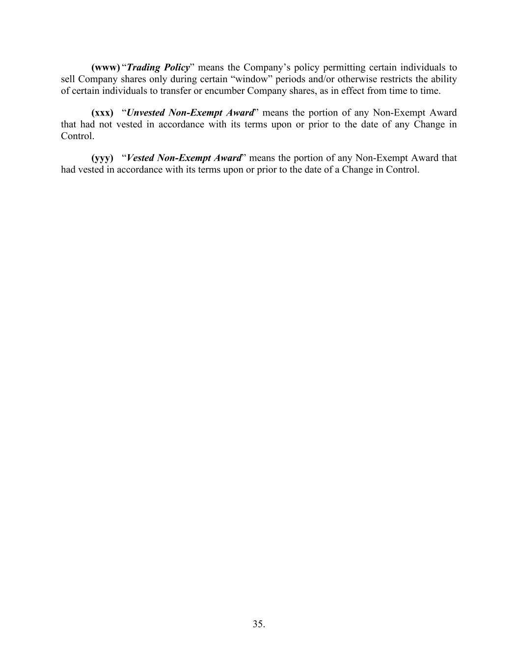 35. (www) “Trading Policy” means the Company’s policy permitting certain individuals to sell Company shares only during certain “window” periods and/or otherwise restricts the ability of certain individuals to transfer or encumber Company shares, as in effect from time to time. (xxx) “Unvested Non-Exempt Award” means the portion of any Non-Exempt Award that had not vested in accordance with its terms upon or prior to the date of any Change in Control. (yyy) “Vested Non-Exempt Award” means the portion of any Non-Exempt Award that had vested in accordance with its terms upon or prior to the date of a Change in Control.