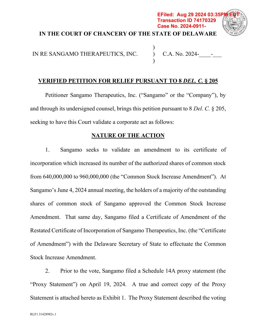 RLF1 31428982v.1 IN THE COURT OF CHANCERY OF THE STATE OF DELAWARE IN RE SANGAMO THERAPEUTICS, INC. ) ) ) C.A. No. 2024-____-___ VERIFIED PETITION FOR RELIEF PURSUANT TO 8 DEL. C. § 205 Petitioner Sangamo Therapeutics, Inc. (“Sangamo” or the “Company”), by and through its undersigned counsel, brings this petition pursuant to 8 Del. C. § 205, seeking to have this Court validate a corporate act as follows: NATURE OF THE ACTION 1. Sangamo seeks to validate an amendment to its certificate of incorporation which increased its number of the authorized shares of common stock from 640,000,000 to 960,000,000 (the “Common Stock Increase Amendment”). At Sangamo’s June 4, 2024 annual meeting, the holders of a majority of the outstanding shares of common stock of Sangamo approved the Common Stock Increase Amendment. That same day, Sangamo filed a Certificate of Amendment of the Restated Certificate of Incorporation of Sangamo Therapeutics, Inc. (the “Certificate of Amendment”) with the Delaware Secretary of State to effectuate the Common Stock Increase Amendment. 2. Prior to the vote, Sangamo filed a Schedule 14A proxy statement (the “Proxy Statement”) on April 19, 2024. A true and correct copy of the Proxy Statement is attached hereto as Exhibit 1. The Proxy Statement described the voting EFiled: Aug 29 2024 03:35PM EDT Transaction ID 74170329 Case No. 2024-0911-