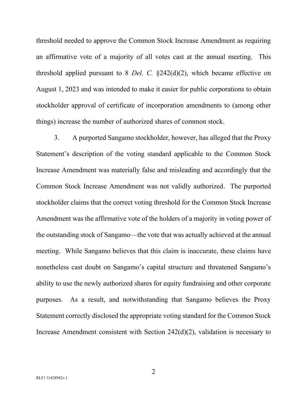 2 RLF1 31428982v.1 threshold needed to approve the Common Stock Increase Amendment as requiring an affirmative vote of a majority of all votes cast at the annual meeting. This threshold applied pursuant to 8 Del. C. §242(d)(2), which became effective on August 1, 2023 and was intended to make it easier for public corporations to obtain stockholder approval of certificate of incorporation amendments to (among other things) increase the number of authorized shares of common stock. 3. A purported Sangamo stockholder, however, has alleged that the Proxy Statement’s description of the voting standard applicable to the Common Stock Increase Amendment was materially false and misleading and accordingly that the Common Stock Increase Amendment was not validly authorized. The purported stockholder claims that the correct voting threshold for the Common Stock Increase Amendment was the affirmative vote of the holders of a majority in voting power of the outstanding stock of Sangamo—the vote that was actually achieved at the annual meeting. While Sangamo believes that this claim is inaccurate, these claims have nonetheless cast doubt on Sangamo’s capital structure and threatened Sangamo’s ability to use the newly authorized shares for equity fundraising and other corporate purposes. As a result, and notwithstanding that Sangamo believes the Proxy Statement correctly disclosed the appropriate voting standard for the Common Stock Increase Amendment consistent with Section 242(d)(2), validation is necessary to