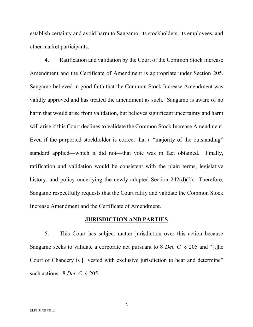 3 RLF1 31428982v.1 establish certainty and avoid harm to Sangamo, its stockholders, its employees, and other market participants. 4. Ratification and validation by the Court of the Common Stock Increase Amendment and the Certificate of Amendment is appropriate under Section 205. Sangamo believed in good faith that the Common Stock Increase Amendment was validly approved and has treated the amendment as such. Sangamo is aware of no harm that would arise from validation, but believes significant uncertainty and harm will arise if this Court declines to validate the Common Stock Increase Amendment. Even if the purported stockholder is correct that a “majority of the outstanding” standard applied—which it did not—that vote was in fact obtained. Finally, ratification and validation would be consistent with the plain terms, legislative history, and policy underlying the newly adopted Section 242(d)(2). Therefore, Sangamo respectfully requests that the Court ratify and validate the Common Stock Increase Amendment and the Certificate of Amendment. JURISDICTION AND PARTIES 5. This Court has subject matter jurisdiction over this action because Sangamo seeks to validate a corporate act pursuant to 8 Del. C. § 205 and “[t]he Court of Chancery is [] vested with exclusive jurisdiction to hear and determine” such actions. 8 Del. C. § 205.