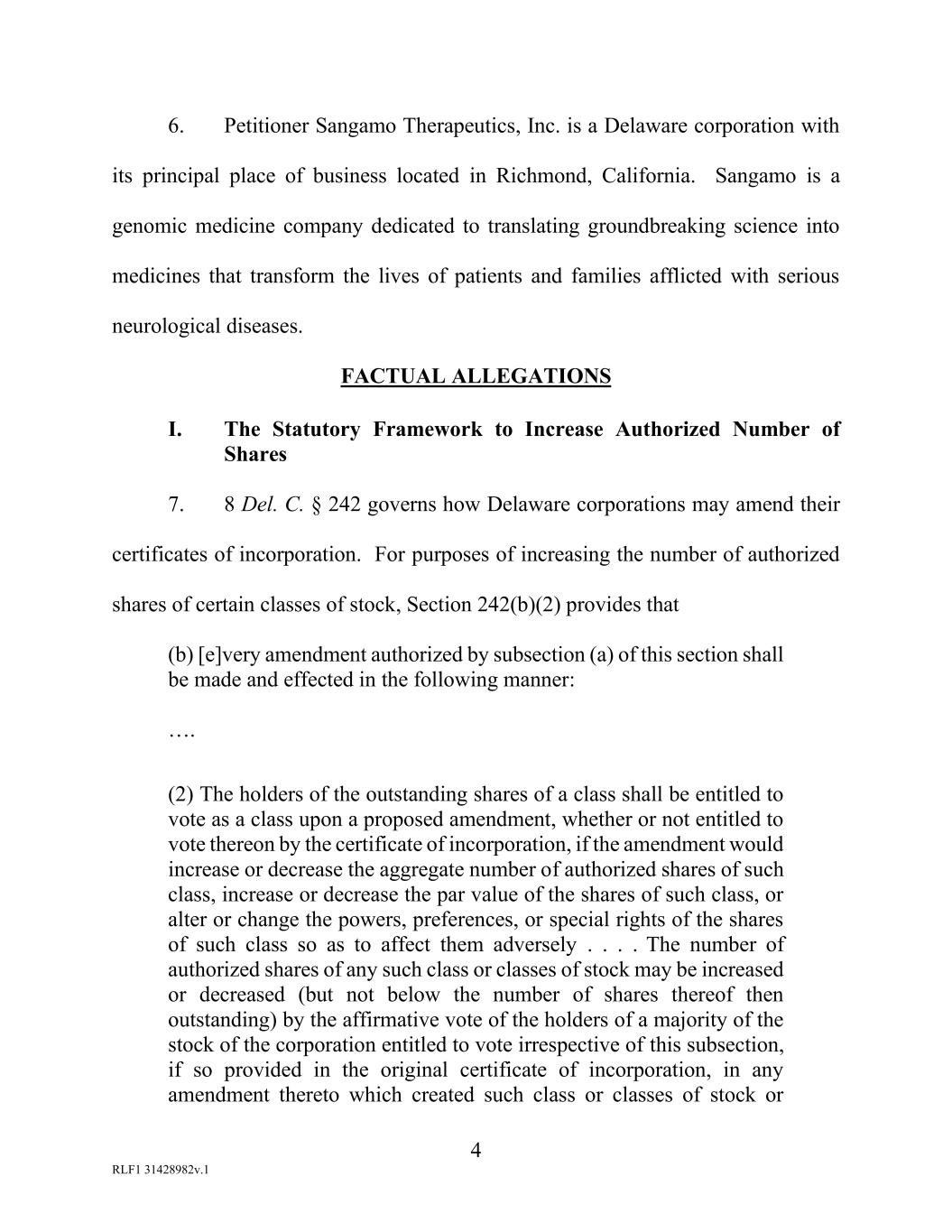 4 RLF1 31428982v.1 6. Petitioner Sangamo Therapeutics, Inc. is a Delaware corporation with its principal place of business located in Richmond, California. Sangamo is a genomic medicine company dedicated to translating groundbreaking science into medicines that transform the lives of patients and families afflicted with serious neurological diseases. FACTUAL ALLEGATIONS I. The Statutory Framework to Increase Authorized Number of Shares 7. 8 Del. C. § 242 governs how Delaware corporations may amend their certificates of incorporation. For purposes of increasing the number of authorized shares of certain classes of stock, Section 242(b)(2) provides that (b) [e]very amendment authorized by subsection (a) of this section shall be made and effected in the following manner: …. (2) The holders of the outstanding shares of a class shall be entitled to vote as a class upon a proposed amendment, whether or not entitled to vote thereon by the certificate of incorporation, if the amendment would increase or decrease the aggregate number of authorized shares of such class, increase or decrease the par value of the shares of such class, or alter or change the powers, preferences, or special rights of the shares of such class so as to affect them adversely . . . . The number of authorized shares of any such class or classes of stock may be increased or decreased (but not below the number of shares thereof then outstanding) by the affirmative vote of the holders of a majority of the stock of the corporation entitled to vote irrespective of this subsection, if so provided in the original certificate of incorporation, in any amendment thereto which created such class or classes of stock or