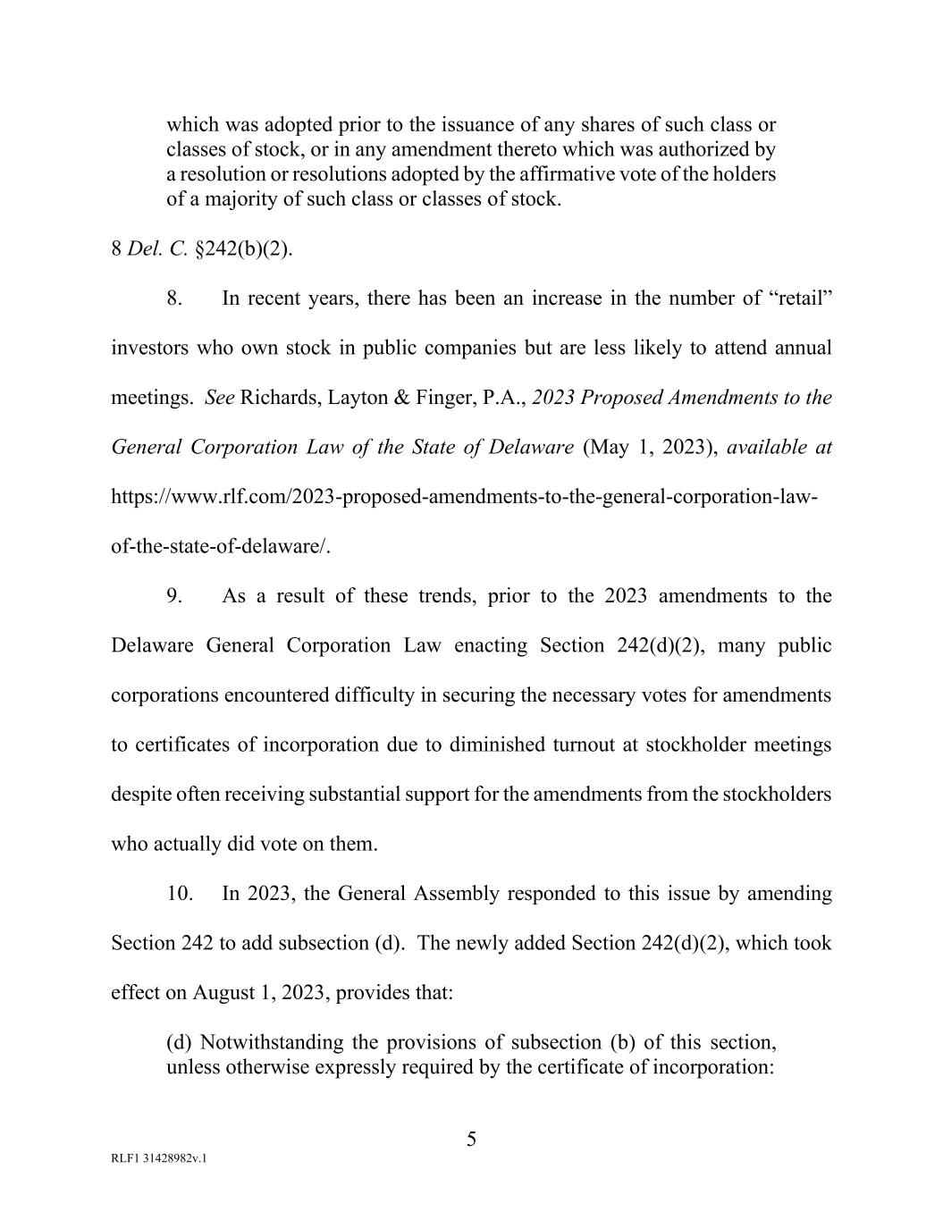 5 RLF1 31428982v.1 which was adopted prior to the issuance of any shares of such class or classes of stock, or in any amendment thereto which was authorized by a resolution or resolutions adopted by the affirmative vote of the holders of a majority of such class or classes of stock. 8 Del. C. §242(b)(2). 8. In recent years, there has been an increase in the number of “retail” investors who own stock in public companies but are less likely to attend annual meetings. See Richards, Layton & Finger, P.A., 2023 Proposed Amendments to the General Corporation Law of the State of Delaware (May 1, 2023), available at https://www.rlf.com/2023-proposed-amendments-to-the-general-corporation-law- of-the-state-of-delaware/. 9. As a result of these trends, prior to the 2023 amendments to the Delaware General Corporation Law enacting Section 242(d)(2), many public corporations encountered difficulty in securing the necessary votes for amendments to certificates of incorporation due to diminished turnout at stockholder meetings despite often receiving substantial support for the amendments from the stockholders who actually did vote on them. 10. In 2023, the General Assembly responded to this issue by amending Section 242 to add subsection (d). The newly added Section 242(d)(2), which took effect on August 1, 2023, provides that: (d) Notwithstanding the provisions of subsection (b) of this section, unless otherwise expressly required by the certificate of incorporation: