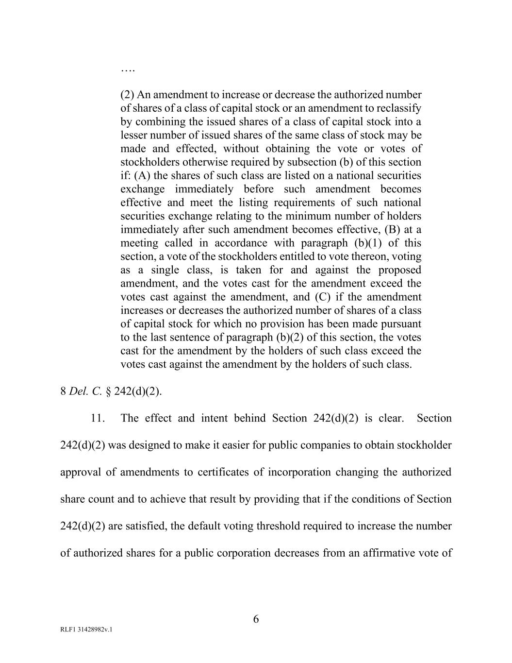 6 RLF1 31428982v.1 …. (2) An amendment to increase or decrease the authorized number of shares of a class of capital stock or an amendment to reclassify by combining the issued shares of a class of capital stock into a lesser number of issued shares of the same class of stock may be made and effected, without obtaining the vote or votes of stockholders otherwise required by subsection (b) of this section if: (A) the shares of such class are listed on a national securities exchange immediately before such amendment becomes effective and meet the listing requirements of such national securities exchange relating to the minimum number of holders immediately after such amendment becomes effective, (B) at a meeting called in accordance with paragraph (b)(1) of this section, a vote of the stockholders entitled to vote thereon, voting as a single class, is taken for and against the proposed amendment, and the votes cast for the amendment exceed the votes cast against the amendment, and (C) if the amendment increases or decreases the authorized number of shares of a class of capital stock for which no provision has been made pursuant to the last sentence of paragraph (b)(2) of this section, the votes cast for the amendment by the holders of such class exceed the votes cast against the amendment by the holders of such class. 8 Del. C. § 242(d)(2). 11. The effect and intent behind Section 242(d)(2) is clear. Section 242(d)(2) was designed to make it easier for public companies to obtain stockholder approval of amendments to certificates of incorporation changing the authorized share count and to achieve that result by providing that if the conditions of Section 242(d)(2) are satisfied, the default voting threshold required to increase the number of authorized shares for a public corporation decreases from an affirmative vote of