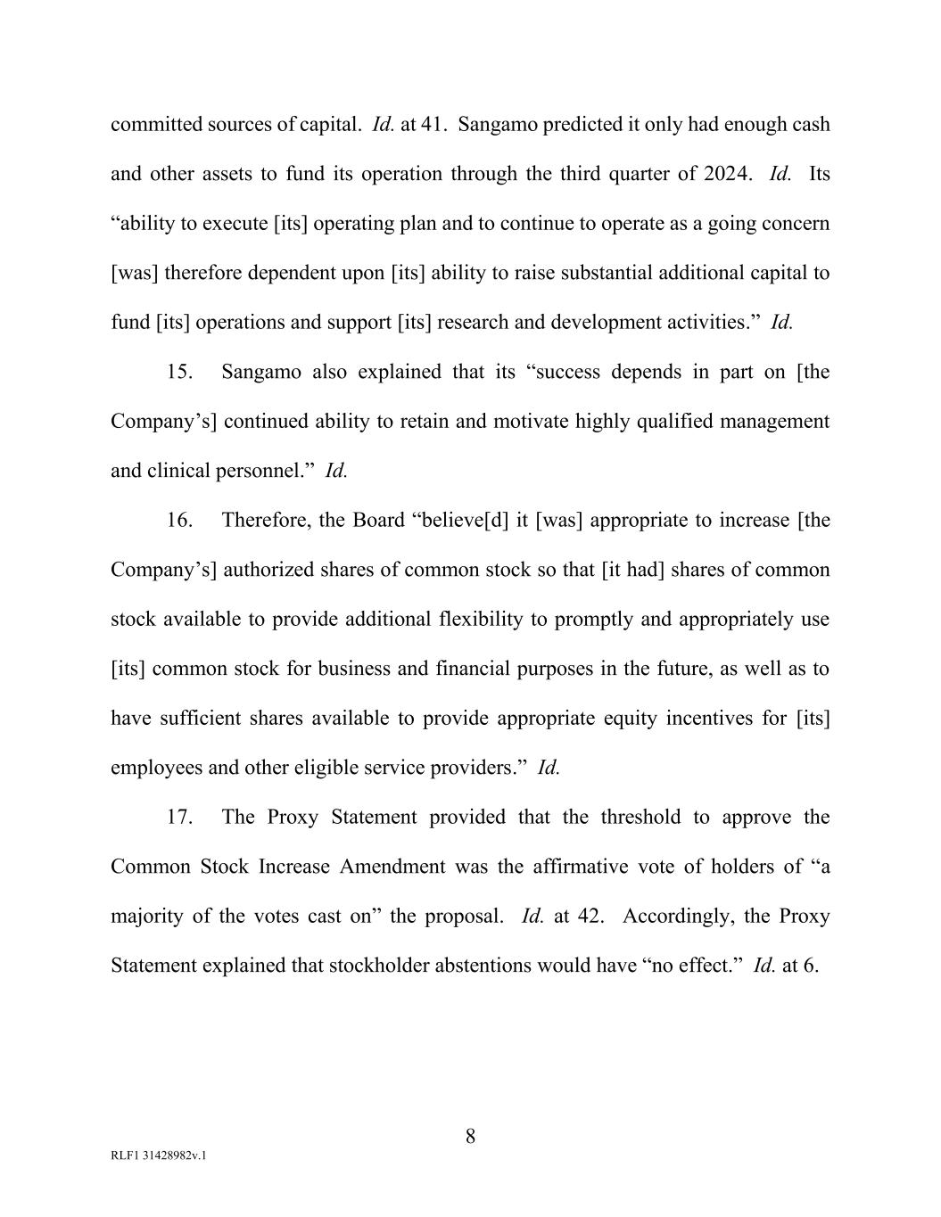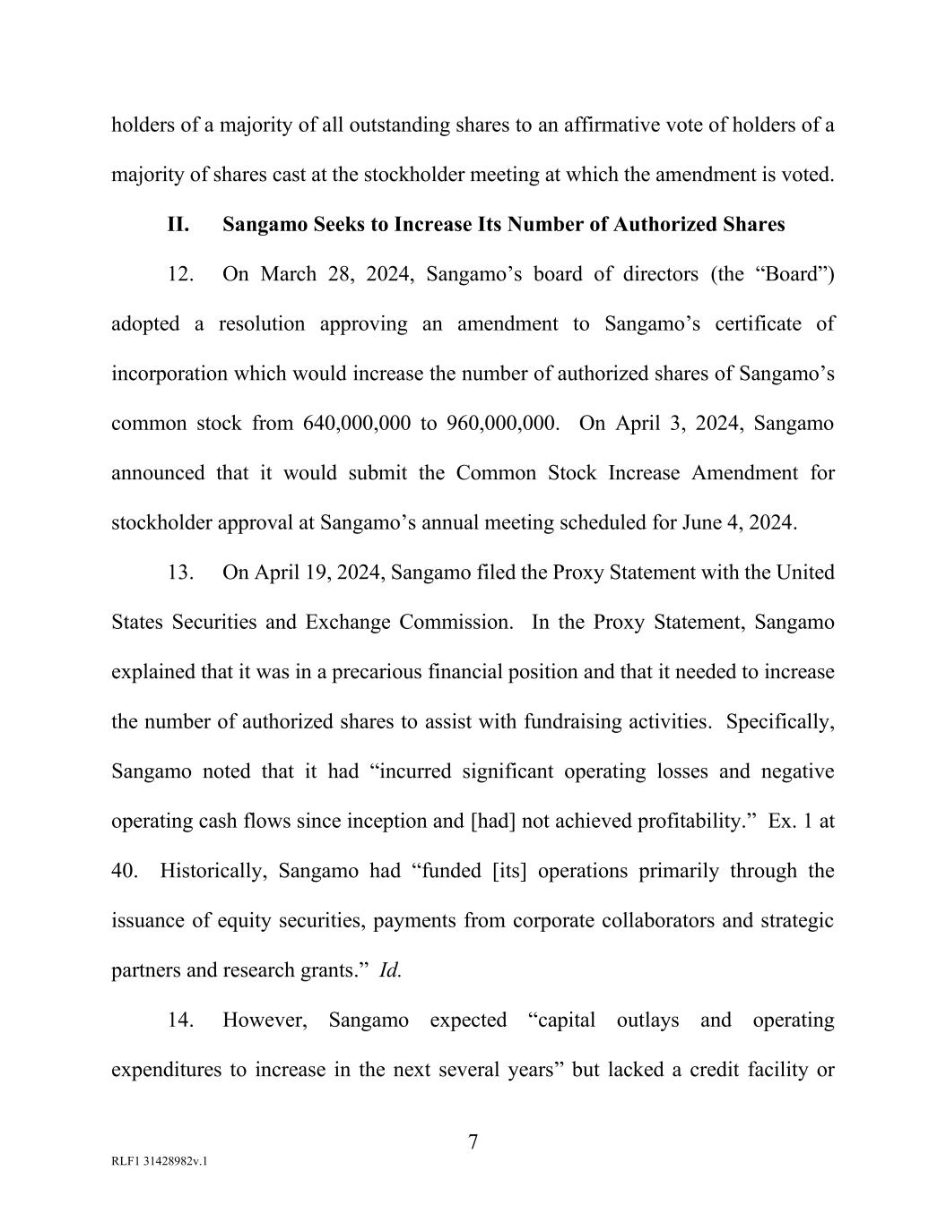 7 RLF1 31428982v.1 holders of a majority of all outstanding shares to an affirmative vote of holders of a majority of shares cast at the stockholder meeting at which the amendment is voted. II. Sangamo Seeks to Increase Its Number of Authorized Shares 12. On March 28, 2024, Sangamo’s board of directors (the “Board”) adopted a resolution approving an amendment to Sangamo’s certificate of incorporation which would increase the number of authorized shares of Sangamo’s common stock from 640,000,000 to 960,000,000. On April 3, 2024, Sangamo announced that it would submit the Common Stock Increase Amendment for stockholder approval at Sangamo’s annual meeting scheduled for June 4, 2024. 13. On April 19, 2024, Sangamo filed the Proxy Statement with the United States Securities and Exchange Commission. In the Proxy Statement, Sangamo explained that it was in a precarious financial position and that it needed to increase the number of authorized shares to assist with fundraising activities. Specifically, Sangamo noted that it had “incurred significant operating losses and negative operating cash flows since inception and [had] not achieved profitability.” Ex. 1 at 40. Historically, Sangamo had “funded [its] operations primarily through the issuance of equity securities, payments from corporate collaborators and strategic partners and research grants.” Id. 14. However, Sangamo expected “capital outlays and operating expenditures to increase in the next several years” but lacked a credit facility or