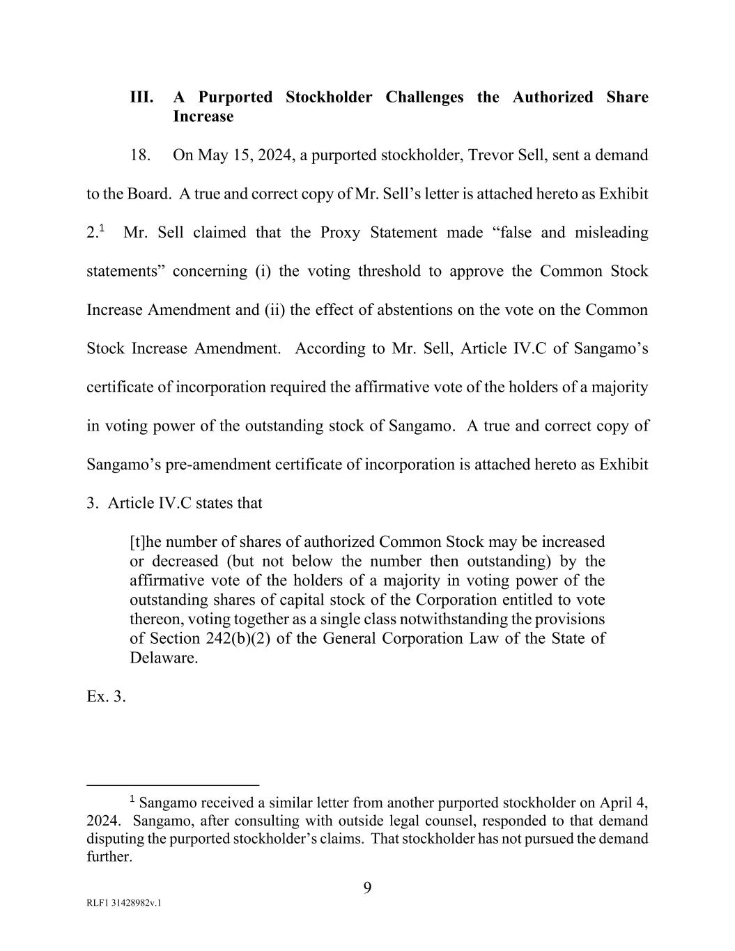 9 RLF1 31428982v.1 III. A Purported Stockholder Challenges the Authorized Share Increase 18. On May 15, 2024, a purported stockholder, Trevor Sell, sent a demand to the Board. A true and correct copy of Mr. Sell’s letter is attached hereto as Exhibit 2.1 Mr. Sell claimed that the Proxy Statement made “false and misleading statements” concerning (i) the voting threshold to approve the Common Stock Increase Amendment and (ii) the effect of abstentions on the vote on the Common Stock Increase Amendment. According to Mr. Sell, Article IV.C of Sangamo’s certificate of incorporation required the affirmative vote of the holders of a majority in voting power of the outstanding stock of Sangamo. A true and correct copy of Sangamo’s pre-amendment certificate of incorporation is attached hereto as Exhibit 3. Article IV.C states that [t]he number of shares of authorized Common Stock may be increased or decreased (but not below the number then outstanding) by the affirmative vote of the holders of a majority in voting power of the outstanding shares of capital stock of the Corporation entitled to vote thereon, voting together as a single class notwithstanding the provisions of Section 242(b)(2) of the General Corporation Law of the State of Delaware. Ex. 3. 1 Sangamo received a similar letter from another purported stockholder on April 4, 2024. Sangamo, after consulting with outside legal counsel, responded to that demand disputing the purported stockholder’s claims. That stockholder has not pursued the demand further.