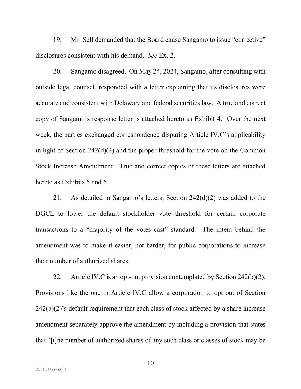 10 RLF1 31428982v.1 19. Mr. Sell demanded that the Board cause Sangamo to issue “corrective” disclosures consistent with his demand. See Ex. 2. 20. Sangamo disagreed. On May 24, 2024, Sangamo, after consulting with outside legal counsel, responded with a letter explaining that its disclosures were accurate and consistent with Delaware and federal securities law. A true and correct copy of Sangamo’s response letter is attached hereto as Exhibit 4. Over the next week, the parties exchanged correspondence disputing Article IV.C’s applicability in light of Section 242(d)(2) and the proper threshold for the vote on the Common Stock Increase Amendment. True and correct copies of these letters are attached hereto as Exhibits 5 and 6. 21. As detailed in Sangamo’s letters, Section 242(d)(2) was added to the DGCL to lower the default stockholder vote threshold for certain corporate transactions to a “majority of the votes cast” standard. The intent behind the amendment was to make it easier, not harder, for public corporations to increase their number of authorized shares. 22. Article IV.C is an opt-out provision contemplated by Section 242(b)(2). Provisions like the one in Article IV.C allow a corporation to opt out of Section 242(b)(2)’s default requirement that each class of stock affected by a share increase amendment separately approve the amendment by including a provision that states that “[t]he number of authorized shares of any such class or classes of stock may be