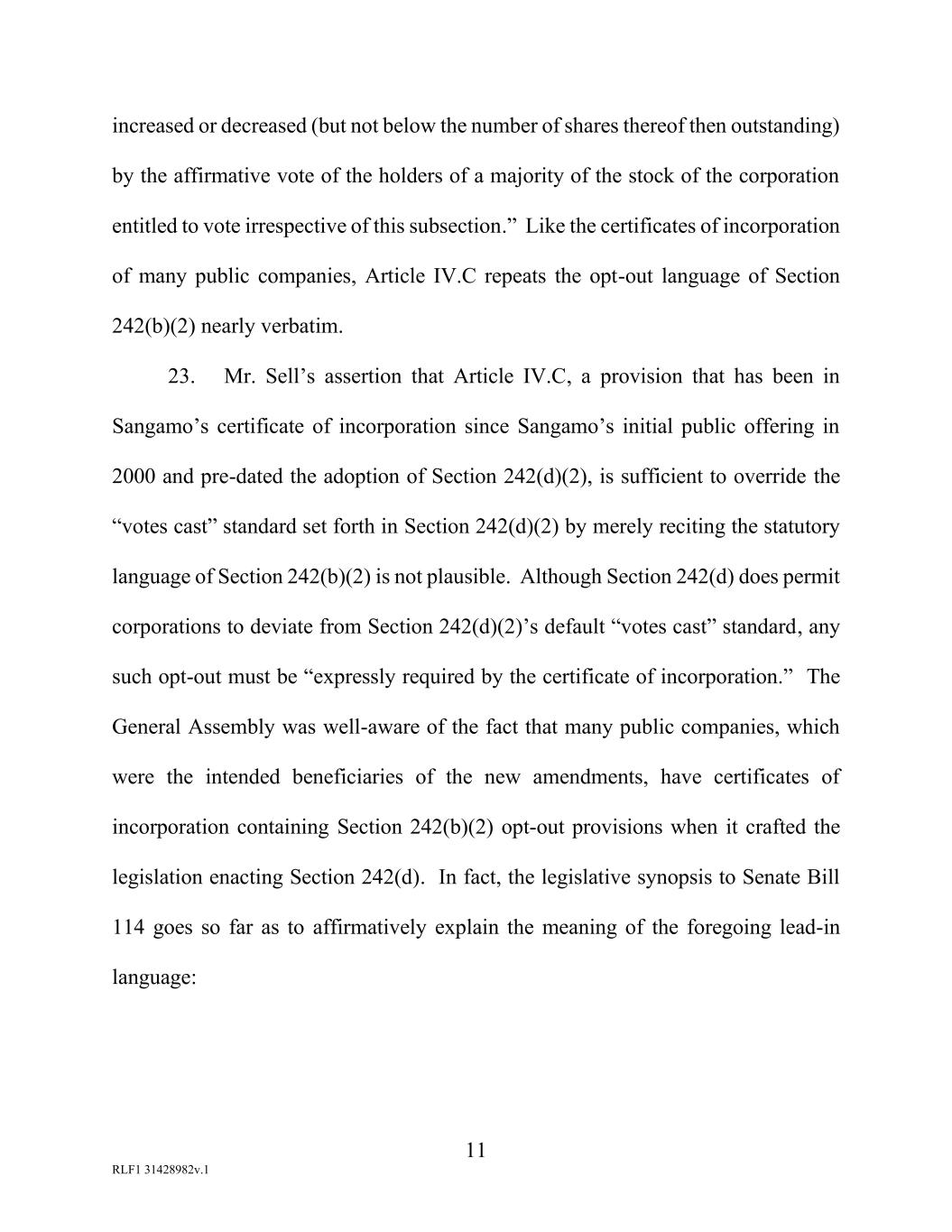 11 RLF1 31428982v.1 increased or decreased (but not below the number of shares thereof then outstanding) by the affirmative vote of the holders of a majority of the stock of the corporation entitled to vote irrespective of this subsection.” Like the certificates of incorporation of many public companies, Article IV.C repeats the opt-out language of Section 242(b)(2) nearly verbatim. 23. Mr. Sell’s assertion that Article IV.C, a provision that has been in Sangamo’s certificate of incorporation since Sangamo’s initial public offering in 2000 and pre-dated the adoption of Section 242(d)(2), is sufficient to override the “votes cast” standard set forth in Section 242(d)(2) by merely reciting the statutory language of Section 242(b)(2) is not plausible. Although Section 242(d) does permit corporations to deviate from Section 242(d)(2)’s default “votes cast” standard, any such opt-out must be “expressly required by the certificate of incorporation.” The General Assembly was well-aware of the fact that many public companies, which were the intended beneficiaries of the new amendments, have certificates of incorporation containing Section 242(b)(2) opt-out provisions when it crafted the legislation enacting Section 242(d). In fact, the legislative synopsis to Senate Bill 114 goes so far as to affirmatively explain the meaning of the foregoing lead-in language: