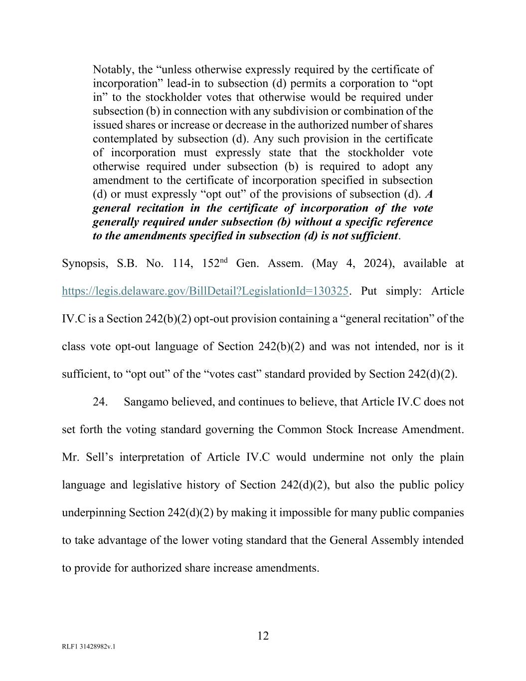 12 RLF1 31428982v.1 Notably, the “unless otherwise expressly required by the certificate of incorporation” lead-in to subsection (d) permits a corporation to “opt in” to the stockholder votes that otherwise would be required under subsection (b) in connection with any subdivision or combination of the issued shares or increase or decrease in the authorized number of shares contemplated by subsection (d). Any such provision in the certificate of incorporation must expressly state that the stockholder vote otherwise required under subsection (b) is required to adopt any amendment to the certificate of incorporation specified in subsection (d) or must expressly “opt out” of the provisions of subsection (d). A general recitation in the certificate of incorporation of the vote generally required under subsection (b) without a specific reference to the amendments specified in subsection (d) is not sufficient. Synopsis, S.B. No. 114, 152nd Gen. Assem. (May 4, 2024), available at https://legis.delaware.gov/BillDetail?LegislationId=130325. Put simply: Article IV.C is a Section 242(b)(2) opt-out provision containing a “general recitation” of the class vote opt-out language of Section 242(b)(2) and was not intended, nor is it sufficient, to “opt out” of the “votes cast” standard provided by Section 242(d)(2). 24. Sangamo believed, and continues to believe, that Article IV.C does not set forth the voting standard governing the Common Stock Increase Amendment. Mr. Sell’s interpretation of Article IV.C would undermine not only the plain language and legislative history of Section 242(d)(2), but also the public policy underpinning Section 242(d)(2) by making it impossible for many public companies to take advantage of the lower voting standard that the General Assembly intended to provide for authorized share increase amendments.