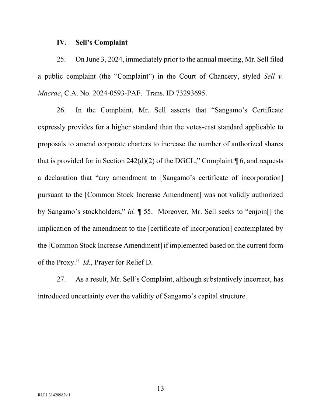 13 RLF1 31428982v.1 IV. Sell’s Complaint 25. On June 3, 2024, immediately prior to the annual meeting, Mr. Sell filed a public complaint (the “Complaint”) in the Court of Chancery, styled Sell v. Macrae, C.A. No. 2024-0593-PAF. Trans. ID 73293695. 26. In the Complaint, Mr. Sell asserts that “Sangamo’s Certificate expressly provides for a higher standard than the votes-cast standard applicable to proposals to amend corporate charters to increase the number of authorized shares that is provided for in Section 242(d)(2) of the DGCL,” Complaint ¶ 6, and requests a declaration that “any amendment to [Sangamo’s certificate of incorporation] pursuant to the [Common Stock Increase Amendment] was not validly authorized by Sangamo’s stockholders,” id. ¶ 55. Moreover, Mr. Sell seeks to “enjoin[] the implication of the amendment to the [certificate of incorporation] contemplated by the [Common Stock Increase Amendment] if implemented based on the current form of the Proxy.” Id., Prayer for Relief D. 27. As a result, Mr. Sell’s Complaint, although substantively incorrect, has introduced uncertainty over the validity of Sangamo’s capital structure.