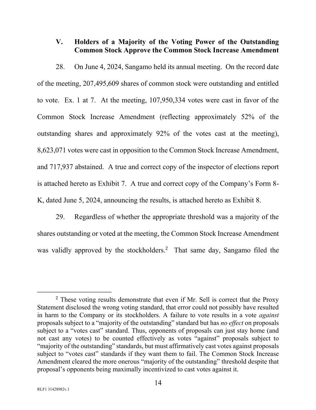 14 RLF1 31428982v.1 V. Holders of a Majority of the Voting Power of the Outstanding Common Stock Approve the Common Stock Increase Amendment 28. On June 4, 2024, Sangamo held its annual meeting. On the record date of the meeting, 207,495,609 shares of common stock were outstanding and entitled to vote. Ex. 1 at 7. At the meeting, 107,950,334 votes were cast in favor of the Common Stock Increase Amendment (reflecting approximately 52% of the outstanding shares and approximately 92% of the votes cast at the meeting), 8,623,071 votes were cast in opposition to the Common Stock Increase Amendment, and 717,937 abstained. A true and correct copy of the inspector of elections report is attached hereto as Exhibit 7. A true and correct copy of the Company’s Form 8- K, dated June 5, 2024, announcing the results, is attached hereto as Exhibit 8. 29. Regardless of whether the appropriate threshold was a majority of the shares outstanding or voted at the meeting, the Common Stock Increase Amendment was validly approved by the stockholders.2 That same day, Sangamo filed the 2 These voting results demonstrate that even if Mr. Sell is correct that the Proxy Statement disclosed the wrong voting standard, that error could not possibly have resulted in harm to the Company or its stockholders. A failure to vote results in a vote against proposals subject to a “majority of the outstanding” standard but has no effect on proposals subject to a “votes cast” standard. Thus, opponents of proposals can just stay home (and not cast any votes) to be counted effectively as votes “against” proposals subject to “majority of the outstanding” standards, but must affirmatively cast votes against proposals subject to “votes cast” standards if they want them to fail. The Common Stock Increase Amendment cleared the more onerous “majority of the outstanding” threshold despite that proposal’s opponents being maximally incentivized to cast votes against it.