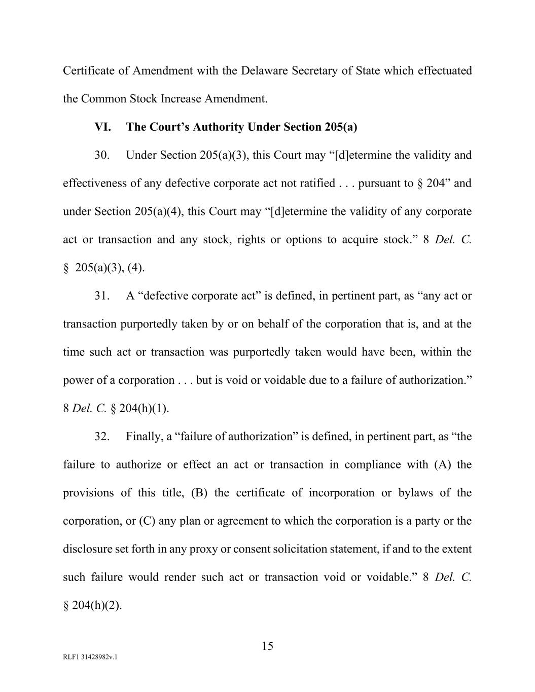 15 RLF1 31428982v.1 Certificate of Amendment with the Delaware Secretary of State which effectuated the Common Stock Increase Amendment. VI. The Court’s Authority Under Section 205(a) 30. Under Section 205(a)(3), this Court may “[d]etermine the validity and effectiveness of any defective corporate act not ratified . . . pursuant to § 204” and under Section 205(a)(4), this Court may “[d]etermine the validity of any corporate act or transaction and any stock, rights or options to acquire stock.” 8 Del. C. § 205(a)(3), (4). 31. A “defective corporate act” is defined, in pertinent part, as “any act or transaction purportedly taken by or on behalf of the corporation that is, and at the time such act or transaction was purportedly taken would have been, within the power of a corporation . . . but is void or voidable due to a failure of authorization.” 8 Del. C. § 204(h)(1). 32. Finally, a “failure of authorization” is defined, in pertinent part, as “the failure to authorize or effect an act or transaction in compliance with (A) the provisions of this title, (B) the certificate of incorporation or bylaws of the corporation, or (C) any plan or agreement to which the corporation is a party or the disclosure set forth in any proxy or consent solicitation statement, if and to the extent such failure would render such act or transaction void or voidable.” 8 Del. C. § 204(h)(2).