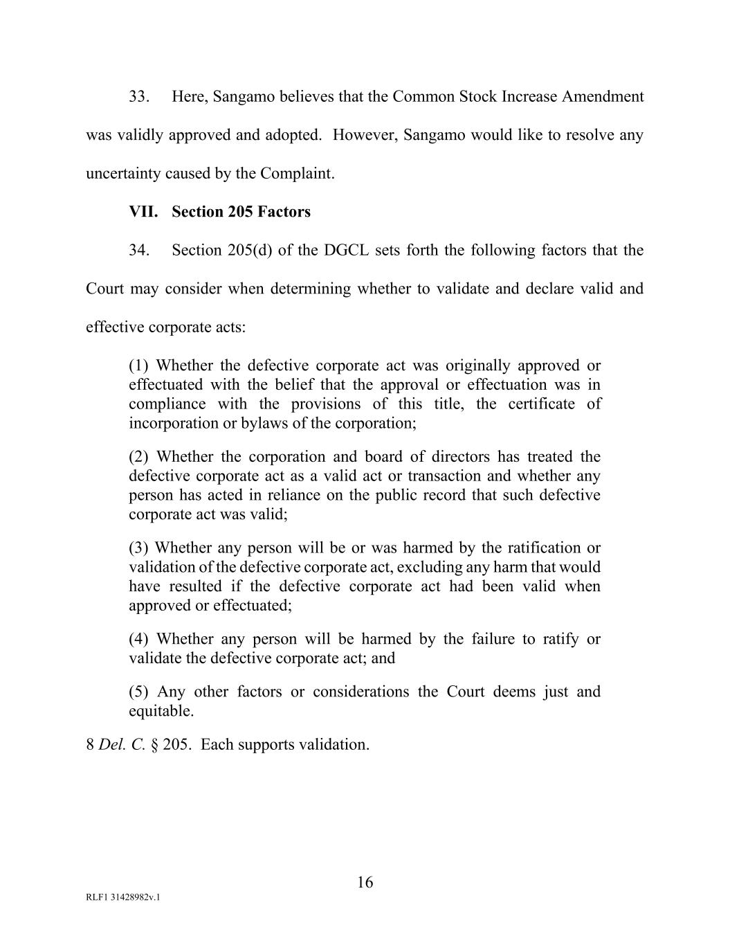 16 RLF1 31428982v.1 33. Here, Sangamo believes that the Common Stock Increase Amendment was validly approved and adopted. However, Sangamo would like to resolve any uncertainty caused by the Complaint. VII. Section 205 Factors 34. Section 205(d) of the DGCL sets forth the following factors that the Court may consider when determining whether to validate and declare valid and effective corporate acts: (1) Whether the defective corporate act was originally approved or effectuated with the belief that the approval or effectuation was in compliance with the provisions of this title, the certificate of incorporation or bylaws of the corporation; (2) Whether the corporation and board of directors has treated the defective corporate act as a valid act or transaction and whether any person has acted in reliance on the public record that such defective corporate act was valid; (3) Whether any person will be or was harmed by the ratification or validation of the defective corporate act, excluding any harm that would have resulted if the defective corporate act had been valid when approved or effectuated; (4) Whether any person will be harmed by the failure to ratify or validate the defective corporate act; and (5) Any other factors or considerations the Court deems just and equitable. 8 Del. C. § 205. Each supports validation.