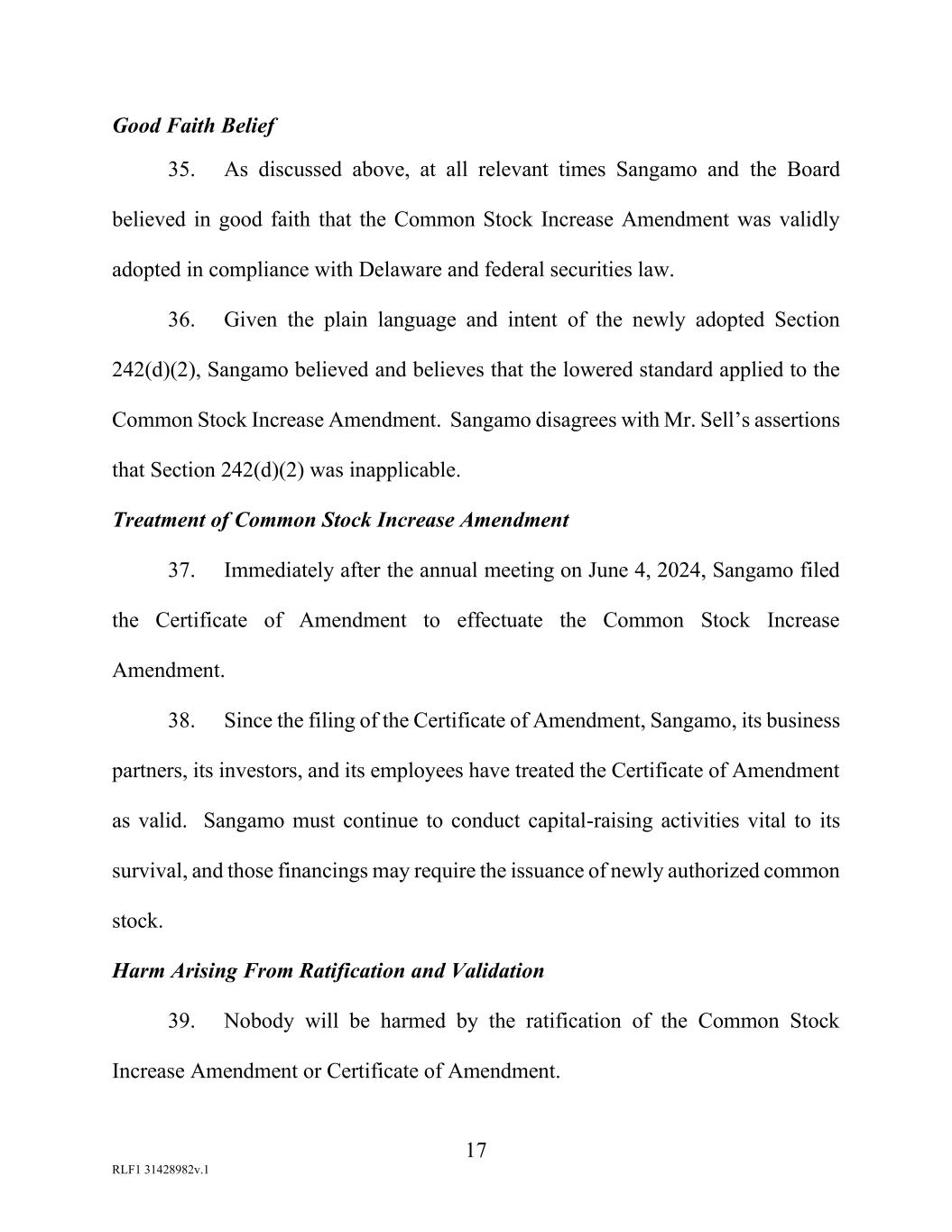 17 RLF1 31428982v.1 Good Faith Belief 35. As discussed above, at all relevant times Sangamo and the Board believed in good faith that the Common Stock Increase Amendment was validly adopted in compliance with Delaware and federal securities law. 36. Given the plain language and intent of the newly adopted Section 242(d)(2), Sangamo believed and believes that the lowered standard applied to the Common Stock Increase Amendment. Sangamo disagrees with Mr. Sell’s assertions that Section 242(d)(2) was inapplicable. Treatment of Common Stock Increase Amendment 37. Immediately after the annual meeting on June 4, 2024, Sangamo filed the Certificate of Amendment to effectuate the Common Stock Increase Amendment. 38. Since the filing of the Certificate of Amendment, Sangamo, its business partners, its investors, and its employees have treated the Certificate of Amendment as valid. Sangamo must continue to conduct capital-raising activities vital to its survival, and those financings may require the issuance of newly authorized common stock. Harm Arising From Ratification and Validation 39. Nobody will be harmed by the ratification of the Common Stock Increase Amendment or Certificate of Amendment.