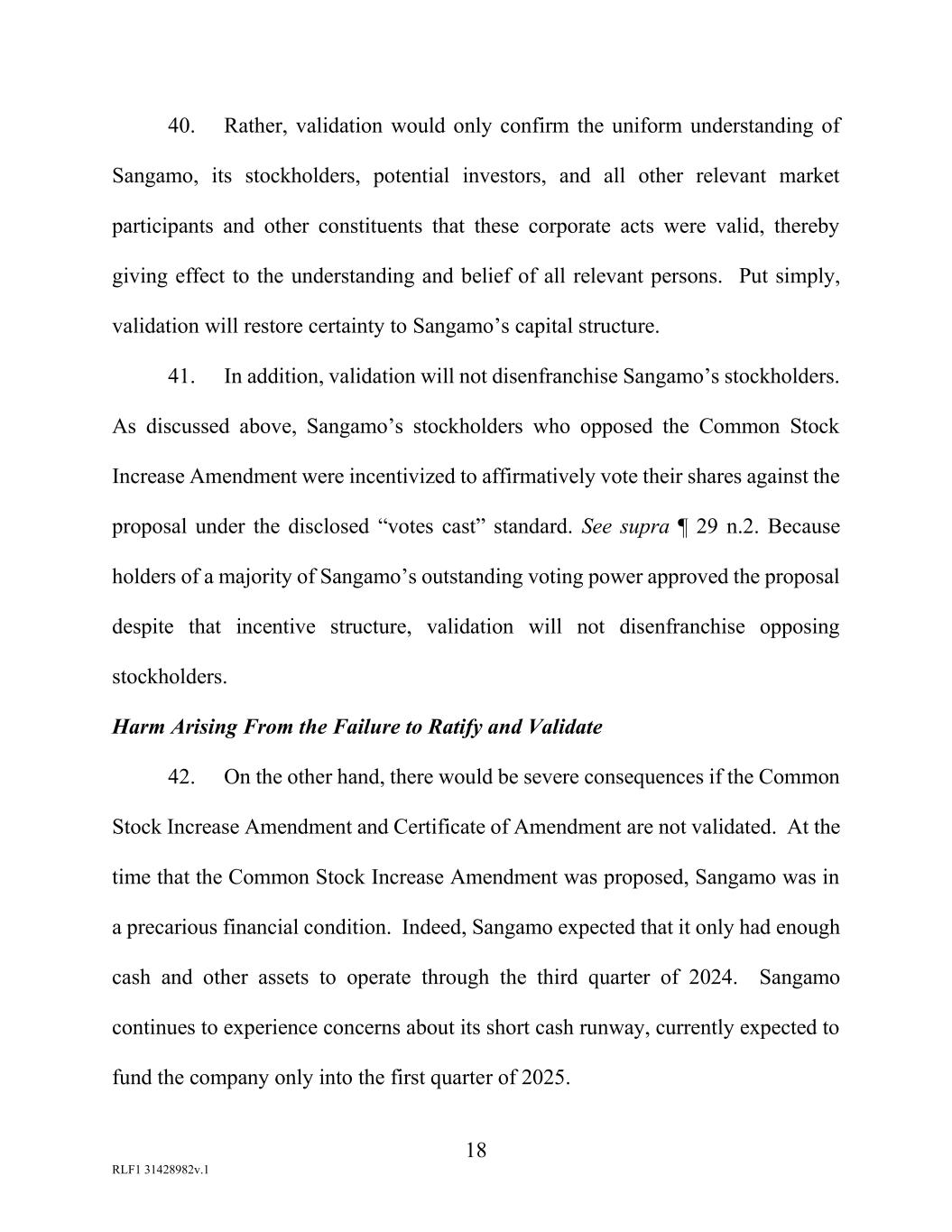 18 RLF1 31428982v.1 40. Rather, validation would only confirm the uniform understanding of Sangamo, its stockholders, potential investors, and all other relevant market participants and other constituents that these corporate acts were valid, thereby giving effect to the understanding and belief of all relevant persons. Put simply, validation will restore certainty to Sangamo’s capital structure. 41. In addition, validation will not disenfranchise Sangamo’s stockholders. As discussed above, Sangamo’s stockholders who opposed the Common Stock Increase Amendment were incentivized to affirmatively vote their shares against the proposal under the disclosed “votes cast” standard. See supra ¶ 29 n.2. Because holders of a majority of Sangamo’s outstanding voting power approved the proposal despite that incentive structure, validation will not disenfranchise opposing stockholders. Harm Arising From the Failure to Ratify and Validate 42. On the other hand, there would be severe consequences if the Common Stock Increase Amendment and Certificate of Amendment are not validated. At the time that the Common Stock Increase Amendment was proposed, Sangamo was in a precarious financial condition. Indeed, Sangamo expected that it only had enough cash and other assets to operate through the third quarter of 2024. Sangamo continues to experience concerns about its short cash runway, currently expected to fund the company only into the first quarter of 2025.