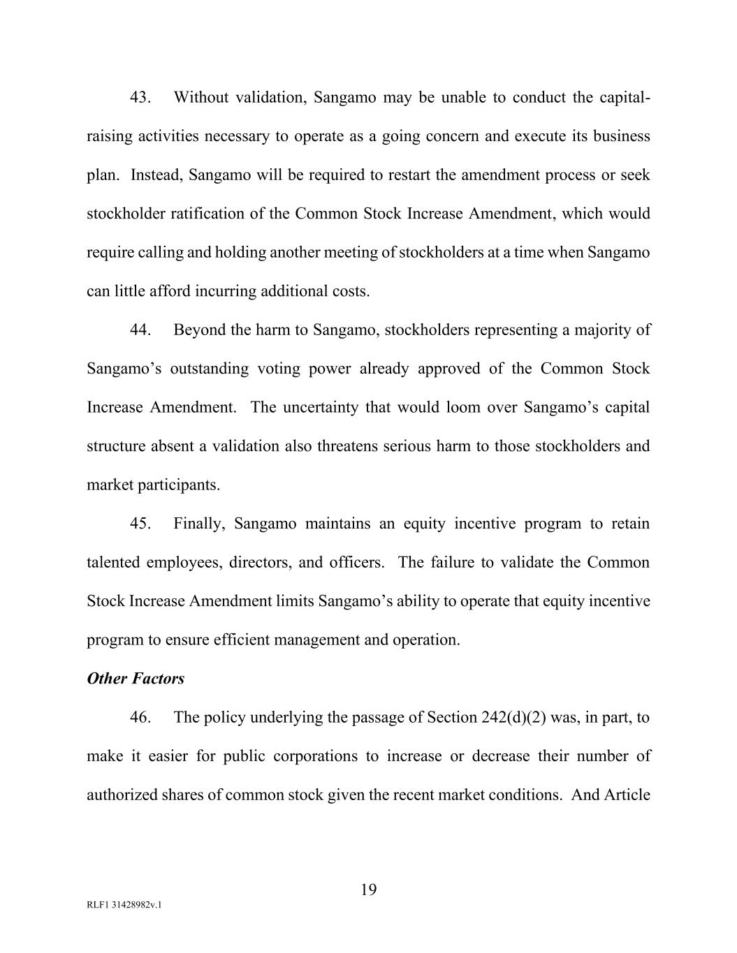 19 RLF1 31428982v.1 43. Without validation, Sangamo may be unable to conduct the capital- raising activities necessary to operate as a going concern and execute its business plan. Instead, Sangamo will be required to restart the amendment process or seek stockholder ratification of the Common Stock Increase Amendment, which would require calling and holding another meeting of stockholders at a time when Sangamo can little afford incurring additional costs. 44. Beyond the harm to Sangamo, stockholders representing a majority of Sangamo’s outstanding voting power already approved of the Common Stock Increase Amendment. The uncertainty that would loom over Sangamo’s capital structure absent a validation also threatens serious harm to those stockholders and market participants. 45. Finally, Sangamo maintains an equity incentive program to retain talented employees, directors, and officers. The failure to validate the Common Stock Increase Amendment limits Sangamo’s ability to operate that equity incentive program to ensure efficient management and operation. Other Factors 46. The policy underlying the passage of Section 242(d)(2) was, in part, to make it easier for public corporations to increase or decrease their number of authorized shares of common stock given the recent market conditions. And Article