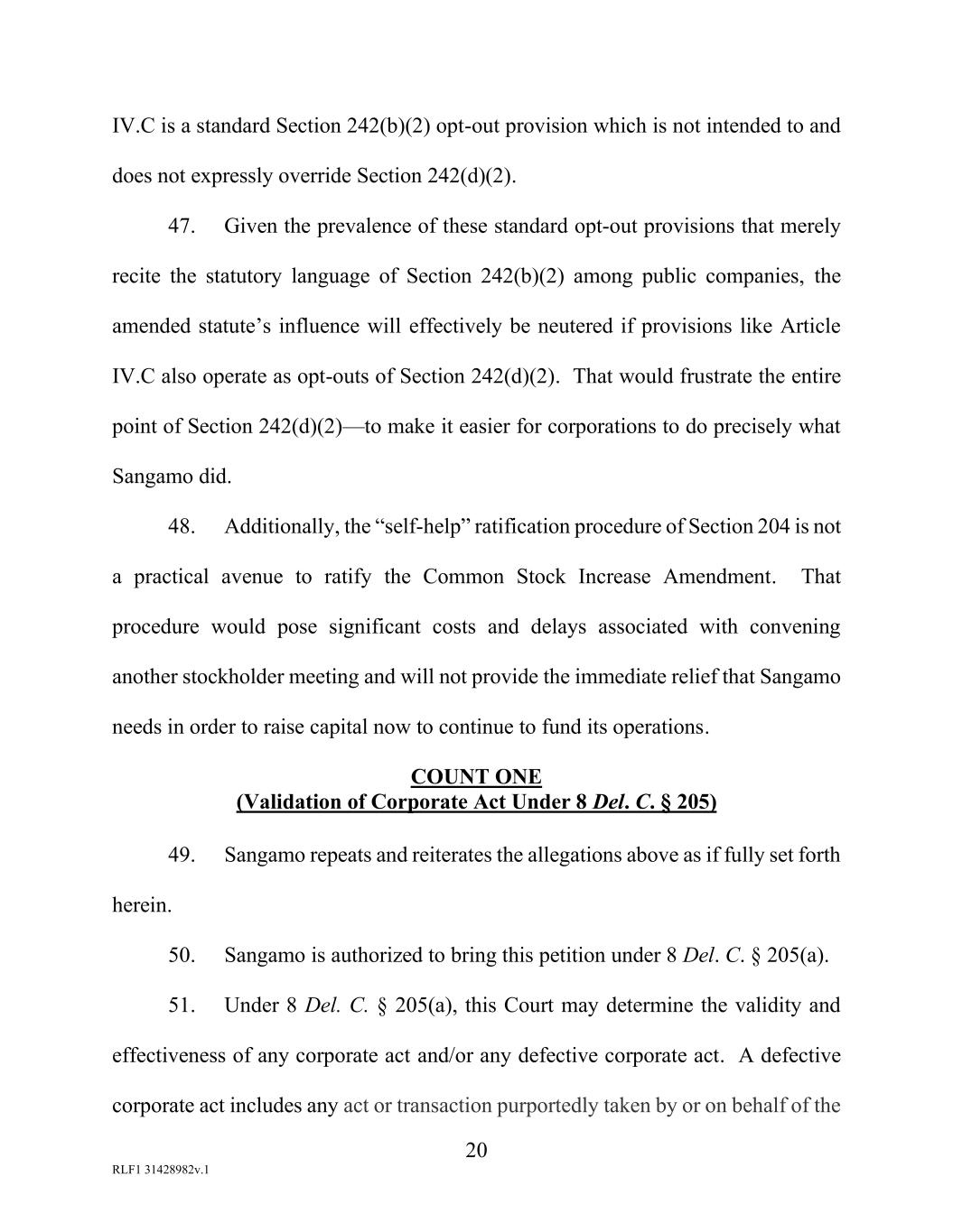 20 RLF1 31428982v.1 IV.C is a standard Section 242(b)(2) opt-out provision which is not intended to and does not expressly override Section 242(d)(2). 47. Given the prevalence of these standard opt-out provisions that merely recite the statutory language of Section 242(b)(2) among public companies, the amended statute’s influence will effectively be neutered if provisions like Article IV.C also operate as opt-outs of Section 242(d)(2). That would frustrate the entire point of Section 242(d)(2)—to make it easier for corporations to do precisely what Sangamo did. 48. Additionally, the “self-help” ratification procedure of Section 204 is not a practical avenue to ratify the Common Stock Increase Amendment. That procedure would pose significant costs and delays associated with convening another stockholder meeting and will not provide the immediate relief that Sangamo needs in order to raise capital now to continue to fund its operations. COUNT ONE (Validation of Corporate Act Under 8 Del. C. § 205) 49. Sangamo repeats and reiterates the allegations above as if fully set forth herein. 50. Sangamo is authorized to bring this petition under 8 Del. C. § 205(a). 51. Under 8 Del. C. § 205(a), this Court may determine the validity and effectiveness of any corporate act and/or any defective corporate act. A defective corporate act includes any act or transaction purportedly taken by or on behalf of the