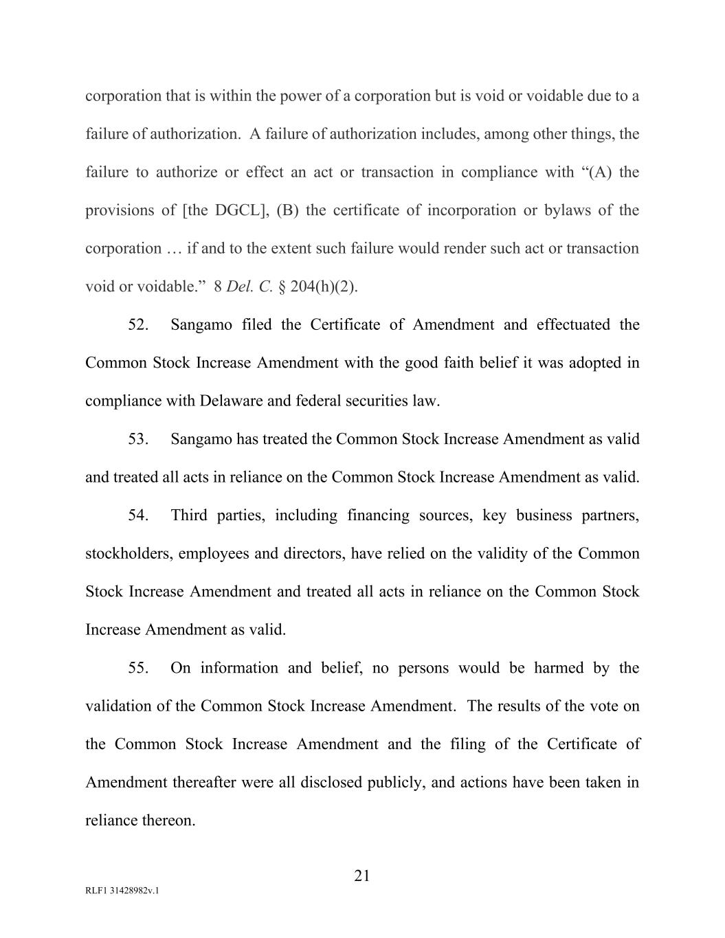 21 RLF1 31428982v.1 corporation that is within the power of a corporation but is void or voidable due to a failure of authorization. A failure of authorization includes, among other things, the failure to authorize or effect an act or transaction in compliance with “(A) the provisions of [the DGCL], (B) the certificate of incorporation or bylaws of the corporation … if and to the extent such failure would render such act or transaction void or voidable.” 8 Del. C. § 204(h)(2). 52. Sangamo filed the Certificate of Amendment and effectuated the Common Stock Increase Amendment with the good faith belief it was adopted in compliance with Delaware and federal securities law. 53. Sangamo has treated the Common Stock Increase Amendment as valid and treated all acts in reliance on the Common Stock Increase Amendment as valid. 54. Third parties, including financing sources, key business partners, stockholders, employees and directors, have relied on the validity of the Common Stock Increase Amendment and treated all acts in reliance on the Common Stock Increase Amendment as valid. 55. On information and belief, no persons would be harmed by the validation of the Common Stock Increase Amendment. The results of the vote on the Common Stock Increase Amendment and the filing of the Certificate of Amendment thereafter were all disclosed publicly, and actions have been taken in reliance thereon.