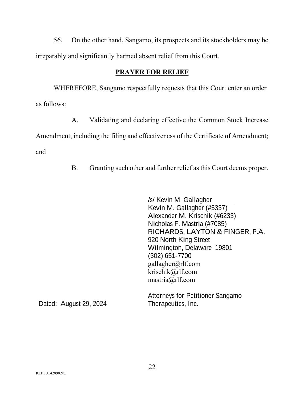 22 RLF1 31428982v.1 56. On the other hand, Sangamo, its prospects and its stockholders may be irreparably and significantly harmed absent relief from this Court. PRAYER FOR RELIEF WHEREFORE, Sangamo respectfully requests that this Court enter an order as follows: A. Validating and declaring effective the Common Stock Increase Amendment, including the filing and effectiveness of the Certificate of Amendment; and B. Granting such other and further relief as this Court deems proper. Dated: August 29, 2024 /s/ Kevin M. Gallagher Kevin M. Gallagher (#5337) Alexander M. Krischik (#6233) Nicholas F. Mastria (#7085) RICHARDS, LAYTON & FINGER, P.A. 920 North King Street Wilmington, Delaware 19801 (302) 651-7700 gallagher@rlf.com krischik@rlf.com mastria@rlf.com Attorneys for Petitioner Sangamo Therapeutics, Inc.